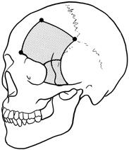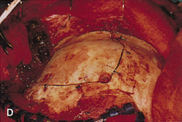 Selected steps in the procedure are demonstrated in Figure 14. A coronal skin incision is made 2 to 3 cm behind the normal hairline. A frontal scalp flap is raised, elevating pericranium off the frontal bone. The supraorbital nerve is identified and, if exiting the skull through a foramen rather than a notch, is chiseled out, mobilizing the nerve. The subperiosteal plane is followed over the superior orbital rim, elevating periorbita from the orbital roof and lateral orbital wall. The temporalis muscle is dissected anteriorly out of the temporalis fossa to expose the temporal bone. Once these soft tissues have been separated from the bone, a high-speed drill is used to cut the bone flap.
