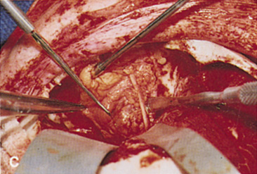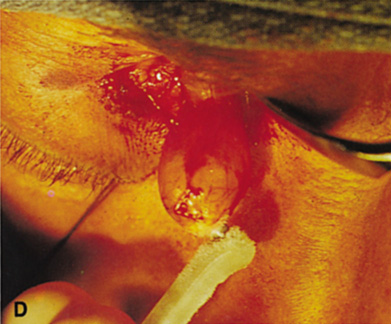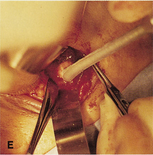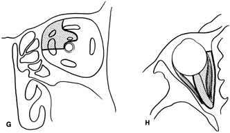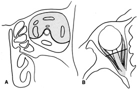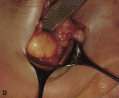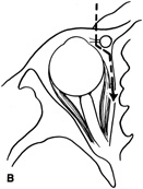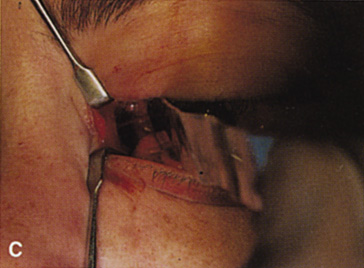 The lateral rim may be left in place and dissection carried out anterior to its posterior recess at the lateral canthus (see Fig. 29B). Because the lateral rim recesses posteriorly at the canthus, the posterior surface of the globe and anterior retrobulbar space usually are accessible. If exposure is limited, the lateral rim can be partially thinned with a bone burr until there is ready access to the retrobulbar space. Sharp dissection through the intermuscular septum allows entry into the retrobulbar intraconal space (see Fig. 29C). Closure is accomplished by simply reapproximating the superior and inferior crura of the lateral canthal tendon and closing the canthotomy skin incision. INDICATIONS Anterior peripheral and intraconal lesions and the lateral retrobulbar optic nerve can be readily approached with this technique. There is no need for disinsertion of the lateral rectus muscle because its belly can be retracted out of the field. |