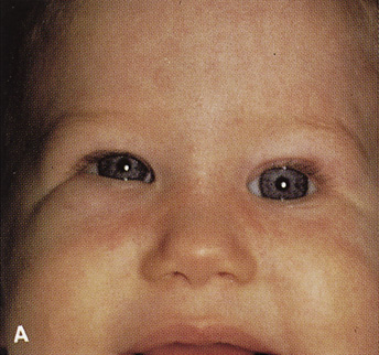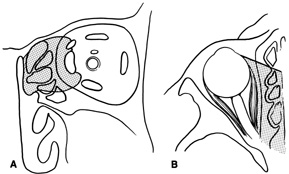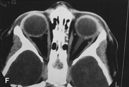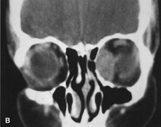 The central surgical space is bounded by the intermuscular septum, which connects the four rectus muscles in the coronal plane. This space also is described as the retrobulbar or intraconal space, and it contains the optic nerve, intraconal fat, and various vascular and neural structures. Primary orbital tumors such as cavernous hemangiomas or optic nerve meningiomas originate in the central surgical space. Many orbital processes involve the extraocular muscles, primarily or secondarily, making it useful to classify the extraocular muscles as residing in their own separate surgical “space.” Conditions affecting the extraocular muscles include thyroid orbitopathy, myositis, and a variety of neoplastic conditions. The peripheral surgical space, also known as the extraconal space, lies outside the intermuscular septum but within the periorbita. This space contains a scant amount of orbital fat, the superior oblique muscle and trochlea, inferior oblique muscle, and lacrimal gland. Other important nerves and vessels extend into the space, such as the superior ophthalmic vein. A variety of pathologic processes may encroach on the peripheral surgical space. The subperiosteal space is a potential space lying between the orbital bones and periorbita. The periorbita may provide a barrier to extension of neoplastic and infectious processes originating in the adjacent sinuses or intracranial cavity. Frequently, the subperiosteal space may fill with blood after orbital fracture or infection when associated with a paranasal sinusitis. The preaponeurotic space is actually an anterior extension of the extraconal space. Because this space is superficial and readily accessible, sometimes it is referred to as its own orbital compartment. Frequently, neoplasms affecting the lacrimal gland, such as lymphoma, extend forward into the preaponeurotic space. Tenon's space is a potential space between the sclera and Tenon's capsule. Tumors originating in the eye, such as choroidal melanoma, may extend into Tenon's space. Secondary orbital tumors may arise from periorbital tissues and secondarily invade the orbit. Cutaneous malignancies arising in the eyelid or facial skin may extend posteriorly through the orbital septum, whereas nasal and paranasal sinus tumors may grow through the orbital bones into or through the subperiosteal space. Tumors arising within the cranial cavity, such as sphenoid wing meningiomas, also may affect the orbit secondarily. |