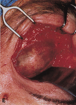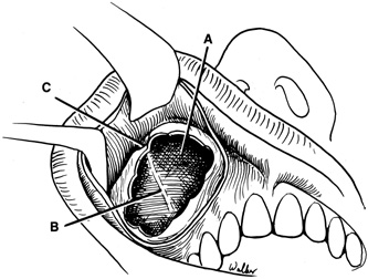 TRANSANTRAL ORBITOTOMY Lesions in the subperiosteal space that involve the orbital floor and roof of the maxillary sinus can be approached through an intraoral incision in the buccal sulcus above the upper canine incisors (Fig. 19). Dissection is carried through mucosa and soft tissue to the periosteum over the face of the maxilla. Dissection is carried superiorly in the subperiosteal plane to just below the inferior orbital rim. Care must be taken to identify the infraorbital nerve as it exits the foramen just below the rim. Osteotomies then are made in the face of the maxilla, and the underlying maxillary sinus is exposed. The sinus mucosa is excised and the roof of the sinus exposed in this fashion. Removal of the sinus roof (the orbital floor) allows exposure of the inferior periorbita. Care must be taken to avoid damage to the infraorbital nerve that runs within the bone of the floor. The inferior rectus muscle is encountered immediately above the periorbita, and it must be protected and retracted during deeper orbital dissection.