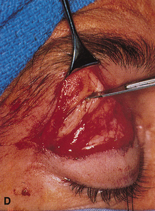 rectus muscle.27 PROCEDURE A 1- to 1.5-cm lateral canthotomy incision is made, and dissection with unipolar cautery is carried down to the lateral rim (Fig. 29A). Periosteum is incised along the long axis of the lateral rim from superior to inferior and elevated from the lateral orbital rim. The periorbita is then elevated from the inner aspect of the lateral orbital rim, and a longitudinal incision from anterior to posterior is made in the periorbita paralleling the underlying lateral rectus muscle.