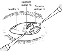 The medial intraconal space also may be accessed through a medial upper eyelid crease incision. This requires exposure of the medial border of the levator aponeurosis and levator muscle and dissection through the intermuscular septum extending between the superior and medial rectus muscles. The superior oblique tendon must be identified and retracted superiorly, so that the medial intraconal space can be entered (Fig. 23).25