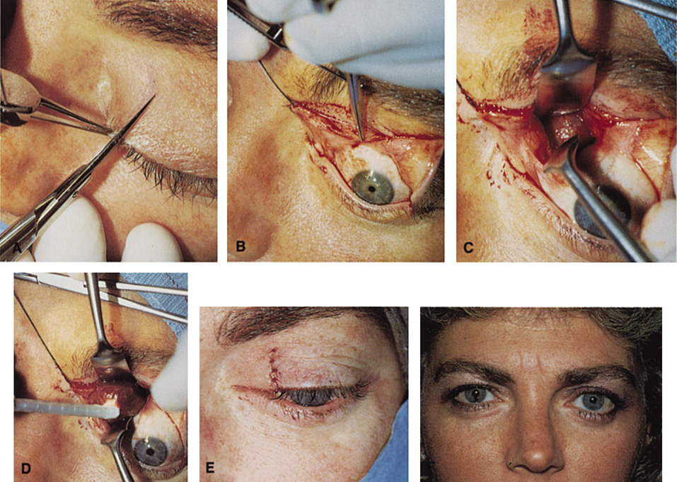 LATERAL ORBITOTOMY Lateral orbitotomy originally was popularized by Kronlein8 in 1888. The incision described by Kronlein was a reverse C-shaped incision placed over the lateral rim and extending superiorly toward the hairline and inferiorly toward the ear. This resulted in an unsightly scar and a high likelihood of damage to the seventh cranial nerve. Subsequently, a number of superior skin incisions have been devised to allow exposure of the bony lateral orbital wall and access to the lateral retrobulbar space.9–11 Currently, the lateral wall is most often approached through either a canthotomy incision (modified Berke),12 or an upper eyelid crease incision extending into a lateral “laugh line.”13 Rarely, a coronal incision in the hairline with subgaleal dissection of a scalp flap carried down to the lateral rim is useful.14,15 Although percutaneous dissection and orbital bone removal can be performed satisfactorily under local anesthesia, deeper orbital manipulation requires retrobulbar injection, which would alter postoperative pupillary evaluation and visual acuity checks. Because visual loss is a well-recognized complication of orbital surgery,16 most lateral orbitotomies are performed under general anesthesia to allow close postoperative monitoring of vision. EYELID CREASE LATERAL ORBITOTOMY This approach affords excellent exposure of the lateral orbital rim through an incision placed within the upper eyelid crease, which may extended laterally into a temporal “laugh line” (Fig. 6). Infiltration with local anesthetic with epinephrine (1:200,000) at least 10 minutes before performing the skin incision minimizes bleeding. The incision is made in the skin to the depth of the orbicularis muscle, and skin and muscle dissected superficial to the orbital septum. Elevation of a skin–muscle flap superiorly and laterally allows exposure of the underlying superior and lateral orbital rims. Dissection in this plane, deep to orbicularis muscle, can be carried inferiorly to the level of the inferior orbital rim. In this fashion the superior and lateral orbital rim can be exposed from a point just lateral to the supraorbital nerve, superiorly, down to the junction of the lateral wall and orbital floor, inferiorly. The periosteum then is incised with the unipolar cautery just posterior to the arcus marginalis along the orbital rim. A Cottle periosteal elevator can be used to elevate periosteum. If the lateral bony rim is to be removed (see Fig. 6), then periosteum usually is elevated first over the external surface of the lateral rim to expose the underlying bone. The lateral rim periosteum fuses with the superficial temporal fascia at the posterior border of the lateral orbital rim. As periosteal elevation progresses posteriorly, the superficial temporal fascia is encountered and cut with unipolar cautery and the anterior temporalis muscle is elevated to expose the temporal fossa. The temporalis muscle may be bluntly swept out of the large temporal fossa by use of gauze wrapped around the surgeon's index finger or a large periosteal elevator. Elevation of periosteum and temporalis muscle is carried superiorly to a point 1 cm above the zygomaticofrontal suture and inferiorly to the level of the zygomatic arch, which is even with the orbital floor (see Fig. 6E). Once the outer surface of the lateral rim has been exposed, the periorbita along the mesial surface of the lateral wall is similarly elevated posteriorly within the orbit so that the bony lateral orbital rim can be completely bared along its external and internal surfaces. The periorbita is tightly adherent at the inner orbital rim (arcus marginalis), especially over the lateral orbital tubercle. Periorbital elevation in this area must be performed carefully to avoid buttonholing and prolapse of orbital fat. Once the elevation has proceeded along the inner surface posterior to the lateral orbital tubercle, the periorbita elevates quite freely from the bone. The zygomaticotemporal and zygomaticofacial neurovascular bundles are encountered about 1 cm posterior to the rim (Fig. 7). Transecting the neurovascular bundles results in a small area of postoperative hypesthesia over the lateral rim. These bundles usually are cut with a unipolar cautery to allow periorbital elevation to continue back to the inferior orbital fissure. The periorbita enters the inferior orbital fissure at the junction of the lateral wall and floor and is a landmark to establish the depth of dissection along the inner surface of the lateral rim.