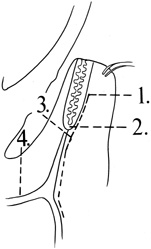 obtain the maximum amount of information from the orbitotomy. Incisions around the orbit are planned with two key considerations in mind. The first is to allow the most direct access to the lesion, and the second is to allow optimal scar camouflage. Incisions may be hidden by placing them within the hairline or brow, in the bulbar conjunctiva, or in the palpebral conjunctiva of the lower lid. A1ternatively, external incisions may be disguised by placing them in preexisting upper or lower eyelid creases, or in lateral canthal rhytides (Fig. 3). Adequate exposure begins with marking the appropriate conjunctival or skin incision. The majority of conjunctival incisions heal without visible scar tissue. However, every skin incision leaves a somewhat visible scar. Thus, there is a tendency to mark as small a skin incision as possible. In some cases, the incision is too small to adequately expose the orbital mass. Hesitation in making a long enough skin incision can be minimized by camouflaging skin incisions as described. Once the skin incision is marked, local anesthetic containing 1:200,000 epinephrine is injected into the adjacent skin. This is done before the surgeon scrubs so that there is sufficient time for vasoconstriction to occur before the skin incision is made. While the surgeon scrubs, the operating room personnel prepare and drape the patient. Because many orbitotomies are performed with the assistance of ophthalmic nurses, there is a tendency to drape an inappropriately small operating field. The operating room staff should be instructed to prepare and drape a generous surgical field. It is usually helpful to prepare and drape both orbits within the field so that the contralateral side may be used as a reference to judge symmetry. Skin incisions usually are made with a No. 15 scalpel blade or a Colorado microdissector needle. Although an adequate-length incision should be made, it is often surprising how extensively the deeper structures can be exposed through a small skin incision when there is wide elevation and retraction of deeper soft tissues overlying the periosteum. If the choice of incision or length of incision is inadequate, the surgical plan should be modified to allow appropriate exposure. Often it is possible to start with a shorter incision, lengthening it if it restricts access. Visualization of deeper orbital tissues involves appropriate retraction of overlying soft tissues. Individual 4-0 silk sutures placed in the subcutaneous tissues offer a large degree of flexibility in retracting the skin and subcutaneous tissues. A variety of orbital retractors should be available for each case. The value of an experienced assistant to provide adequate retraction and exposure cannot be overemphasized. |