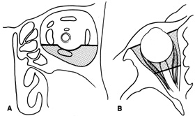 A burr hole is placed in the midline just above the orbital rim. This burr hole usually enters the frontal sinus. A second burr hole is placed anteriorly in the temporalis fossa at the junction of the cranium and orbit so that both compartments are exposed. Two or three additional holes are made in the frontal bone connecting the first two holes. The orbital rim is cut from the midline inferiorly, and the lateral orbital rim is cut from the temporalis fossa anteriorly. The dura is freed from the undersurface of the bone flap and is elevated superiorly, and the orbital roof is cracked off. The frontal bone, orbital roof, and supraorbital rim break off in one piece. The brain is retracted superiorly, and the remaining orbital roof is removed with bone rongeurs (see Fig. 14C). After removal of the bony roof, the periorbita is visible. Typically, the periorbita is thin, and the levator rectus muscle and frontal nerve are visible beneath it. If exposure of the posterior optic nerve is desired, the dura can be elevated over the optic canal. The canal can be unroofed to decompress or explore the optic nerve, and the dura may be opened to view the intracranial optic nerve and the chiasm. At the orbital apex, the annulus may be cut to allow more anterior dissection and removal of the optic nerve in cases such as optic nerve glioma or meningioma. Because the superior orbital fissure and its contents lie lateral to the nerve, the intraconal space is entered on the medial side of the optic nerve. The orbital dissection can be carried out with a minimal amount of brain retraction after the en bloc removal of the frontal bone, supraorbital rim, and orbital roof. After the dissection, the dura is closed and the frontal bone flap is plated or wired back into position (see Fig. 14D). The orbital roof is functionally restored with the replacement of the bone flap. The sinuses must be sealed off with muscle, pericranium, or other tissue. The coronal flap is closed in layers. The postoperative appearance is unchanged because the bone flap is replaced in one piece. Problems with globe ptosis, enophthalmos, pulsatile proptosis, or meningitis are rare. However, extensive mobilization of the temporalis may result in cosmetically significant temporal atrophy. Orbital apical dissection often results in extraocular motility dysfunction as a result of traction on the third, fourth, or sixth cranial nerves, but cranial nerve function usually recovers unless the nerves have been transected. Indications Transcranial orbitotomy provides access to the superior two-thirds of all the orbital compartments (Fig. 15). In some cases, the craniotomy is used only to provide access to the orbit that is otherwise not possible, such as biopsy of an orbital apex mass. Its primary use is for exploration of tumors involving the orbital apex, or large tumors extending above and medial to the optic nerve. The transcranial orbitotomy also is used as part of combined procedures for approaching tumors involving the orbit as well as the anterior and middle cranial fossae. Most commonly, this involves sphenoid wing meningioma resection.