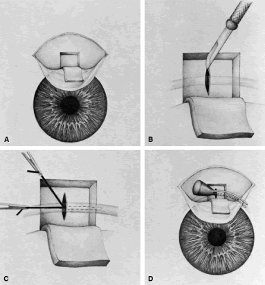 Once the anterior chamber is maintaining a well-formed condition, long-acting cycloplegic agents, such as atropine, can be discontinued. As soon as the intraocular inflammation begins to resolve, the topical steroids can be tapered, and, in most cases, they should be discontinued within 3 weeks of surgery. Longer usage predisposes patients to cataract and steroid-induced glaucoma. Systemic steroids are used by some surgeons, and they may increase the success rate arid tend to produce an eye with a thin, polycystic bleb and a low final IOP. The complications of systemic steroids, however, are significant, and must be taken into account. One of the most helpful maneuvers after a guarded filtration procedure is the CTM,58 which is shown in Figure 16. This technique of applying pressure in a localized fashion directly over the radial edge of the scleral flap is appropriate for guarded filtration procedures that are performed so that the scleral flap overlies a small edge of underlying cornea and sclera. Localized pressure at the radial edge of the flap deforms the edge, disrupting the union between the overlying scleral flap and the underlying corneosclera. Thus, gentle pressure will encourage aqueous to flow through the radial edge of the scleral flap unlike the technique that has been used for generations to encourage aqueous to flow out of a sclerostomy.54 This technique involves pressing oh the globe, which increases the IOP and causes the underlying sclera and cornea to be pushed up against the overlying scleral flap, making the apposition between these two tissues even tighter. Thus, this technique does not work well in patients who have had a guarded filtration procedure and may be more likely to force iris into the internal ostomy opening. The CTM is performed by anesthetizing the eye well with several instillations of proparacaine 0.5%.58 A sterile, cotton-tipped applicator is soaked with the anesthetic agent. With the patient observed at the slit lamp, the upper lid is lifted, the patient is asked to look down, and gentle pressure is applied with the tip of the applicator directly over one of the radial grooves of the scleral flap. This maneuver should be associated with immediate shallowing of the anterior chamber, development of a high bleb, and fall of IOP. If these changes do not occur immediately, the applicator is placed over the other radial incision, and pressure applied. It may be necessary to try several locations until the spot is found where pressure will cause deformation of the incision arid result in encouraging filtration. The CTM should be done gently. In our hands, it has not been associated with complications. It may be repeated three or four times daily for the first 3 or 4 days to encourage the development of a patent fistula. After 2 weeks or so, it probably will not have a permanent effect on the outcome of surgery. We often use the CTM in the early postoperative period. However, we do not believe in long-term continued use of massage or pressure of any kind. In our opinion, this pressure is traumatizing to the eye and rarely results in an improvement in the long-term result. When CTM does not re-establish satisfactory filtration or when the IOP remains higher than the surgeon has hoped and filtration is inadequate, it often is helpful to release one of the 10-0 nylon sutures in the scleral flap by burning the suture transconjunctivally with an argon laser. A small lens is used to flatten the conjunctiva. We use the lens designed by Hoskins.54 The edge of the Zeiss four-mirror lens also may be used. The Hoskins lens compresses the conjunctiva, making a suture in the sclera easily visible. The suture can be burned with a spot size of 50 μm, an exposure time of 0.1 second, and a power of 300 to 700 mW, using the blue or green light of the argon laser. Depending on the laser and the surgeon's technique, more or less power may be necessary. In most cases, one or two applications with a laser will burn through the suture, allowing it to retract and releasing traction on the incision. In many instances, a bleb develops immediately, and IOP falls. Several sutures may need to be released to obtain adequate filtration. As mentioned earlier, when the surgeon plans to release sutures with a laser, a 10-0 nylon suture can be placed in the middle of the posterior edge of the flap so that there is no excessive filtration when sutures are released. In the presence of subconjunctival blood, there is a significant risk of conjunctival burns or holes. Use of the red krypton laser reduces absorption by blood and increases the success of suture lysis in the presence of subconjunctival blood. The management of complications is covered in the third section of this chapter. TRABECULOTOMY Trabeculotomy is useful for managing congenital glaucoma where Schlemm's canal can be identified. Although goniotomy is the procedure of choice in infants or children with congenital glaucoma in whom the cornea is sufficiently clear to allow the surgeon to see into the anterior chamber angle, trabeculotomy is a satisfactory second choice, and it is the preferred procedure where the cornea is hazy. It is of value in the secondary glaucomas as well, especially the open-angle inflammatory glaucomas, such as those seen in association with Still's disease. The procedure demands high magnification; it is best done with an operating microscope. The initial portion of the operation is virtually identical to a guarded filtration procedure (Fig. 17; see also Fig. 15). A fornix-based or limbus-based conjunctival flap is developed at the 12 o'clock position. A scleral flap approximately 4 × 4 mm is fashioned, hinged at the limbus (see Fig. 13A). This flap, however, differs from a guarded filtration procedure flap in that it should be thicker; whereas a trabeculotomy flap ordinarily is one third to one fourth the thickness of the sclera, when performing a trabeculotomy, the scleral flap should be two thirds t