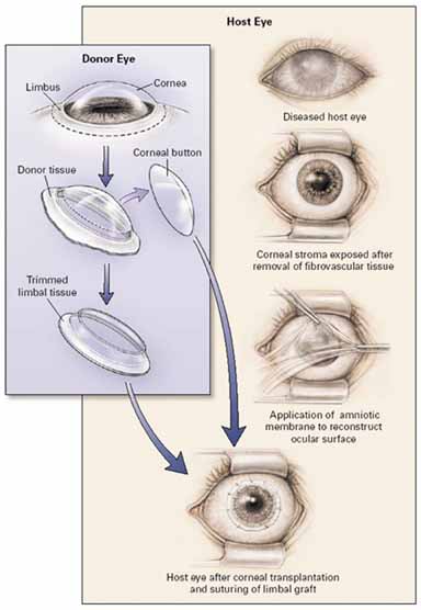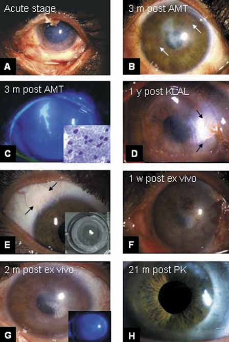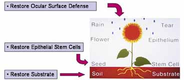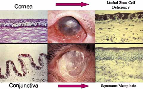 that continue to damage the stromal substrate. FIRST STRATEGY: RESTORE OCULAR SURFACE DEFENSE Before reconstruction, one should realize that keratinization in squamous metaplasia and vascularization in LSCD are two important pathologic mechanisms to prevent such corneal complications as epithelial defects, ulcers, or melt in eyes without an unstable tear film. Therefore, one should avoid performing conventional corneal transplantation to correct these two types of corneal failures if the ocular surface defense cannot first be restored. Because ocular surface reconstruction aims to restore a clear avascular cornea, which will require a stable tear film to maintain its health (see “Basic Concepts” section), it is of utmost important to restore a sound ocular surface defense. If not restored or unable to be restored, poor ocular surface defense in these eyes represent a contraindication for corneal surface reconstruction with epithelial SC transplantation. Deficiencies in ocular surface defense can be recognized by history taking, and external and biomicroscopic examinations, and by the use of special tests such as dynamic tear function test, dye staining and impression cytology. Measures taken to correct severe aqueous tear deficiency dry eye include punctal occlusion and frequent application of autologous serum drops for mechanical microtrauma caused by lid margin and lash abnormalities such as trichiasis, entropion, or meibomian gland orifice metaplasia, which can be corrected by high oxygen permeability (Dk) contact lens, scleral contact lens, or appropriate plastic surgeries including mucous membrane graft. Symblepharon that causes obliteration of tear meniscus, misdirected lashes, inability of adequate blinking and closure, and motility restriction should also be corrected by fornix reconstruction before corneal surface reconstruction. Exposure problems may be corrected by Botox-induced ptosis, high DK contact lens, scleral lens, or tarsorrhaphy. SECOND STRATEGY: RESTORE STROMAL ENVIRONMENT The state and severity of LSCD can be graded as partial or total. In partial LSCD, a portion of the limbal SC remains intact. In partial or total LSCD, if the central cornea still preserves a normal corneal epithelial phenotype and satisfactory vision, treatments should be directed to maintaining the remaining corneal epithelium and to activating the remaining limbal SC. Besides bandage contact lens or scleral lens to shield against continuous attrition, one new way of expanding remaining limbal or conjunctival epithelial SC in vivo is to transplant preserved amniotic membrane to restore stromal environment that has been destroyed in diseases mentioned in Table 1. Amniotic membrane (i.e., the innermost layer of the placental membrane) consists of a simple epithelium, a thick basement membrane, and an avascular stroma. When appropriately procured and processed, cryopreserved amniotic membrane can be used as a surgical graft for substrate replacement and does not elicit immunologic reactions.19 A number of studies have shown that amniotic basement membrane facilitates epithelialization and maintains epithelial phenotype, while amniotic avascular stroma exerts anti-inflammatory, antiangiogenic and antiscarring effects [for reviews see Dua and Azuara-Blanco,20 Kruse et al.,21 Sippel et al.,22 and Tseng and Tsubota23), properties important for reconstruction of epithelium-lining tissues. For partial LSCD, debridement of conjunctivalized epithelium from the corneal surface24 with or without additional amniotic membrane transplantation25 is effective to restore the corneal surface. Because of its anti-inflammatory effect, amniotic membrane transplantation as a temporary patch (bandage) is also effective in restoring ocular surfaces during the acute attack of chemical burns26 and Stevens-Johnson syndrome27. THIRD STRATEGY: RESTORE EPITHELIAL STEM CELLS For corneal surface reconstruction, epithelial SC can be transplanted from the limbal epithelium. For conjunctival surface reconstruction, epithelial SC can be transplanted from the bulbar conjunctival epithelium, especially close to the fornix, where conjunctival epithelial SC are enriched.28 The following section is devoted to restoring corneal surfaces with LSCD. When LSCD is total, that is, involving the entire limbal SC of an eye, amniotic transplantation alone is ineffective, and corneal surface reconstruction requires transplantation of limbal epithelial SC. According to the type and source of tissue removed to transplant limbal epithelial SC, several surgical procedures have been devised, of which each terminology used herein adopts what has been recommended by Holland and Schwartz.29 Conjunctival Limbal Autograft When total LSCD is unilateral, conjunctival limbal autograft (CLAU) from the uninvolved fellow eye is advised.30 The surgical procedure for CLAU is shown in Figure 5. (To view surgical video, please contact Dr. Tseng at stseng@ocularsurface.com.) In brief, the conjunctivalized pannus is removed from the corneal surface by peritomy followed by superficial keratectomy with blunt dissection in the recipient eye (Fig. 5A). The cicatrix was removed from the subconjunctival space (Fig. 5B). This invariably results in the recession of the conjunctival edge to 3 to 5 mm from the limbus (Fig. 5C). Two strips of limbal conjunctival-free grafts, each spanning 6 to 7 mm limbal arc length, are removed by superficial lamellar keratectomy at 1 mm within the limbus from the superior and inferior limbal regions (Fig. 5D) and by including 5 mm of adjacent conjunctiva. These two free grafts are transferred and secured to the recipient eye at the corresponding anatomic sites by interrupted 10-0 nylon sutures to the limbus and 8-0 vicryl sutures to the sclera. The size of the limbal removal in CLAU can be adjusted according to the visual potential of the donor eye and the extent of LSCD in the recipient eye, and the amount of the conjunctiva can be increase
