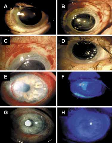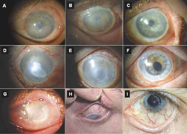 The surgical procedure of KLAL is schematically depicted in Figure 10 (To view surgical video, please contact Dr. Tseng at stseng@ocularsurface.com). It should be noted that after the pannus is removed, the remaining corneal stroma is frequently clear especially in those eyes without ulceration and endothelial dysfunction (Fig. 11), resulting in significant improvement of vision without corneal transplantation. Nevertheless, if the remaining corneal stroma still has a deep scar, visual rehabilitation will require additional corneal transplantation (Fig. 12). If corneal transplantation will have to be performed, it is best to do so as a separate procedure 3 or 4 months later when the eye is not as inflamed (Fig. 12) because there is a high rejection rate for corneal transplants when combined with KLAL at the same setting.35,36,42,45 To avoid this complication, another solution is to perform deep lamellar keratoplasty rather than penetrating keratoplasty especially if there is no corneal endothelial dysfunction.