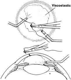If an avulsed tissue pedicle is seen, it should be carefully replaced into position and sutured into place. Such avulsed tissue is best pulled into place by angling sutures toward the apex of the wound.6 CORNEAL LACERATIONS WITH UVEAL PROLAPSE. Iris incarceration and prolapse are frequently noted conditions that accompany corneal lacerations. A peaked pupil signals tissue incarceration. If prolapsed tissue is present, it must first be carefully examined. Usually, macerated, feathery, devitalized, or depigmented iris should be excised. The prolapsed tissue should be evaluated for any signs of surface epithelialization. In this case, it should be excised to prevent any epithelial cells from proliferating in the anterior chamber. In general, tissue that has been prolapsed for longer than 24 hours should be excised to avoid infection; however, if the tissue appears healthy, it may be replaced with caution. Any tissue to be excised should be gently grasped with fine forceps without applying undue traction. The tissue is then cut flush with the cornea. When excising any tissue, every effort is made to preserve as much as possible to maintain a normal iris diaphragm and conserve tissue for secondary reconstructive efforts.8 Incarcerated tissue will usually require mechanical reposition. Selected cases of mild incarceration may be treated with pharmacologic agents. Agents such as intraocular acetylcholine or carbachol cause pupil constriction, thus pulling iris from the wound. If incarcerated iris is located in the central cornea, mydriatic agents (e.g., intraocular epinephrine 1:10,000) may be used. If mechanical reposition is required, simply deepening the anterior chamber may release incarcerated tissue. Viscoelastic agents may be irrigated through the paracentesis port or the wound adjacent to the involved iris tissue in an attempt to draw the incarcerated iris from the wound (Fig. 12). If unsuccessful, a cyclodialysis spatula or irrigating canula may be passed through the paracentesis site and used to directly sweep incarcerated tissue free (Fig. 13). Care is always taken to avoid trauma to the corneal endothelium, iris, and lens. Any excised tissue should be sent to the pathology department for examination.