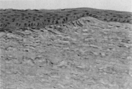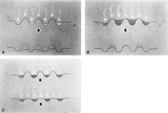 discussed in further detail in the following. Many of these sources of surface irregularity also are associated with corneal opacities. In some cases, smoothing the optical surface alone significantly improves the patient's visual function without the hyperopic shift and potential scarring that can be associated with the deeper ablations often necessary for removal of opacities. Hard contact lens refraction can be helpful in determining what component of a patient's visual complaints is secondary to surface irregularity alone. The improvement in visual acuity with a hard contact lens is attributable to irregularity, and the remaining vision impairment with the hard contact lens in place is caused by the opacity. Irregularities are not intrinsically removed by exposure to repeated pulses of the excimer beam. Photons that encounter an irregular surface do not discriminate between elevations and depressions, and tissue that is removed largely replicates the original irregularity (Fig. 3). Strategies have been devised to protect the deeper tissues (valleys) while exposing elevated pathology (peaks) to the ablating photons. Epithelial hyperplasia commonly occurs in areas of corneal depression. Performing transepithelial ablation, where the thickened epithelium shields the valleys from the laser energy, therefore, can take advantage of the natural masking effect of the epithelium. As an example, one strategy for removing surface irregularities of Reis-Bucklers' dystrophy involves ablating through the epithelium that is intermixed with the abnormal substance until the epithelium is largely absent. This absence is determined by the disappearance of the fluorescence that occurs during epithelial ablation. Further ablation then is performed in conjunction with the use of masking fluids. The most commonly used masking fluids are artificial tear substances, which are available in varying viscosity. Kornmehl and coworkers compared artificial tear substances of varying viscosity with saline and a nonfluid control in an experimental model of surface irregularity.64 In a model in which the corneal surface initially was roughened with sandpaper, solutions of moderate viscosity yielded a smoother surface than more viscous artificial tears, and markedly better results than the nonviscous saline solution. All of these fluids outperformed the nonfluid control. A subsequent study found good results with a preparation of 0.25% sodium hyaluronate.65 Figure 4 shows the theoretic concept that a fluid with inadequate viscosity tends to run off, providing insufficient protection for the valleys, whereas a substance that is too viscous drapes over the peaks, protecting the elevations, where ablation is desired. In addition to the effect of viscosity, different solutions may have varying effectiveness in the absorption of 193-nm photons. A thin film of fluid must have adequate absorption to prevent ablation of the underlying tissue. Enhancing absorption at 193 nm may be one step toward the development of a more effective masking fluid for phototherapeutic keratectomy of an irregular surface. A substance such as a gel also could be applied uniformly over the cornea and molded into a new, smooth anterior surface. This gel would be ablated and, as ablation progresses, would expose the peaks while protecting the valleys without the need for repeated artful application of viscous fluids. For this gel to be fully effective, however, the ablation rate of the gel would have to match that of the pathologic tissue. Such a gel has yet to be implemented in clinical practice.66,67 |