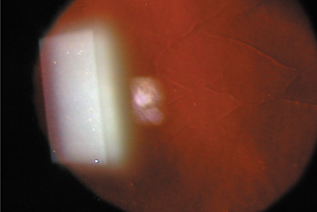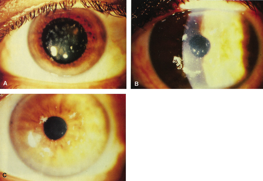 Preventing central island formation requires careful adherence to the manufacturer's recommendations. These include “anti-island” ablation treatments in which extra pulses are delivered to the center of the ablation zone. Some surgeons interrupt the treatment several times to dry the central stroma with a cellulose surgical sponge. The natural history of central islands after PRK is that most resolve or become optically insignificant by 6 months after surgery.2 Although histologic documentation of the healing mechanism of central islands remains unavailable, a common hypothesis is that the central island represents unablated stromal tissue and that the “healing” consists of a thickening of the epithelium in the midperiphery surrounding the island, which gradually envelops and covers the island. After PRK, it is generally prudent to wait at least 6 months in patients with symptomatic central islands before considering retreatment. Some topographically evident central islands do not cause symptoms and should be ignored. When symptoms are present and unchanged after 6 months, and the topography and refractive status are stable, treatment should be considered. After LASIK, in contrast, surface remodeling is minimal. If a symptomatic central island is stable for at least 2 months, relifting the flap and treating the central island in the stromal bed can be considered. Two treatment options for central islands after PRK have been advocated. In the first, the central epithelium is removed with a blade, exposing the central stromal island. The peak of the island is then treated either with a PRK algorithm, whose optical zone is set to the diameter of the central island and whose dioptric correction matches the height of the island, or with a PTK algorithm, again with the diameter set to the width of the island and the number of pulses calculated to create the dioptric flattening needed (approximately 12 pulses per diopter). In either case, the dioptric correction is based on the height of the island as detected on an early topography, usually the 1-month topographic analysis. By 3 to 6 months, the island may appear to be less elevated as a result of partial hyperplasia of the surrounding epithelium; therefore, retreatment will be incomplete. An alternative treatment technique is to retain the epithelium and use a PTK disc ablation equal to the largest diameter of the island. The first area of stroma to be exposed is at the peak of the island if epithelial hyperplasia has occurred around the central island. This can be visualized as the “breakthrough” of the cobalt blue fluorescence that occurs with ablation of the epithelium; fluorescence readily visualized when the room lights and microscope lights are shut off. The ablation through the epithelium progressively exposes the island, whereas the thicker peripheral epithelium shields the surrounding stroma. When the central nonfluorescent stromal island reaches the width of the topographic island as it was seen at 1 month, the island ablation is complete. If the breakthrough of the transepithelial ablation does not occur centrally but rather simultaneously throughout the optical zone, then the surgeon employs PRK or PTK pulses, calculated as described in the preceding paragraph. In either of these techniques, after removal of the tissue island, aggressive topical steroids should be used until stable healing and a stable refractive status are achieved to discourage any central scarring. After LASIK, central islands are treated by lifting the pre-existing flap and ablating the central stroma with a diameter and depth corresponding to the width and height of the island on the topographic map. The authors' preference is to program a myopic correction for the dioptric value of the height of the island on topography. The width is programmed to match the topographic diameter of the island. In the United States, where Food and Drug Administration restrictions may not allow the surgeon to select a small optical zone in myopic corrections, the surgeon using a broad-beam laser can either manually stop the exposure when the ablation is observed to reach the desired size, or, more precisely, apply the number of pulses that correspond to a certain diameter (the laser manufacturer can supply a nomogram interrelating dioptric correction, diameter, and number of pulses). Corneal Haze after PRK After PRK, subepithelial corneal haze usually develops in several weeks, peaks within 1 to 2 months, and then resolves spontaneously during the next 6 to 12 months (Fig. 9). Haze is more prominent in eyes after treating higher degrees of correction, especially when using smaller ablation zones. It is often asymptomatic, being more noticeable to the examiner than the patient. However, sometimes haze can contribute to loss of contrast sensitivity or even loss of best corrected visual acuity.