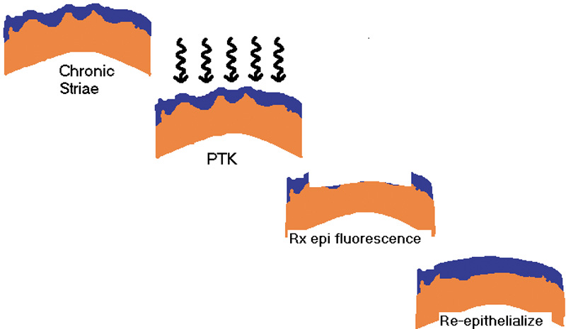 The excimer laser has received much attention for its ability to reshape the corneal surface to correct ametropia. Although correction of postoperative refractive errors and anisometropia has been called therapeutic, PTK typically refers to the use of the excimer laser for the treatment of other corneal disease. This section discusses the application of excimer laser ablation for recurrent erosions, treatment of surface irregularities, removal of superficial opacities, and treatment of complications after photorefractive keratectomy (PRK) and laser in situ keratomileusis (LASIK).42 PTK has been used successfully in pediatric as well as adult diseases.43 |