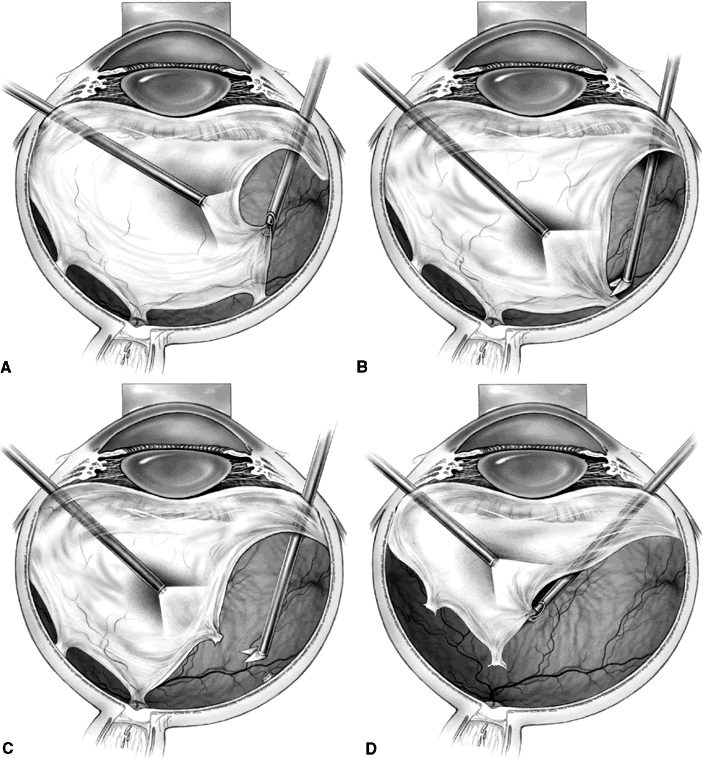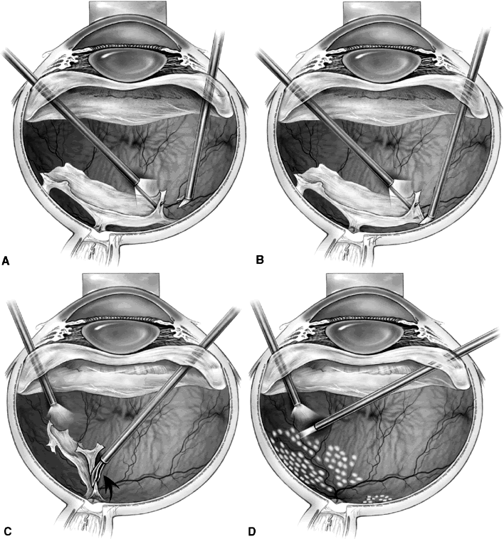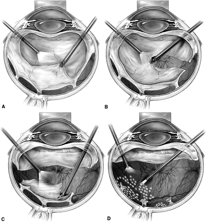 ANESTHESIA Vitrectomy for complications of diabetic retinopathy can be performed with the patient under local or general anesthesia. The choice of anesthesia depends on the surgeon's and patient's preferences, the estimated duration of the procedure, and any systemic conditions that might place the patient at increased risk with general anesthesia. Local anesthesia offers the advantage of minimal disruption of the patient's diabetic management but may not be appropriate for long procedures or for patients who cannot remain immobile. REMOVAL OF VITREOUS HEMORRHAGE If the vitreous hemorrhage is dense, preoperative ultrasonography is useful to delineate areas of retinal detachment and to ascertain whether a posterior vitreous detachment is present. After a core vitrectomy is performed, an opening in the posterior hyaloid is made with the vitrectomy probe. Subhyaloid hemorrhage then is aspirated with the probe or with a soft-tipped extrusion needle. Next, the posterior hyaloid and peripheral vitreous are removed. If no posterior vitreous detachment is present, one can be created by engaging the posterior vitreous over the optic disk or in the posterior pole adjacent to an area of proliferation, or the posterior hyaloid can be incised over an area of subhyaloid hemorrhage. MEMBRANE DISSECTION Techniques for removal of epiretinal fibrovascular membranes have evolved over the past 10 years. Three techniques, or combinations thereof, are commonly used, including (1) segmentation, (2) delamination, and (3) “en bloc” dissection. SEGMENTATION Segmentation was the earliest method used to release retinal traction caused by preretinal fibrovascular proliferation. A core vitrectomy is first performed (Fig. 1A). Anteroposterior traction then is released by circumferentially cutting the posterior vitreous surface around the area of epiretinal proliferation (see Fig. 1B). After the anteroposterior traction has been released and the formed vitreous has been removed, the posterior vitreous surface is cut between epicenters of fibrovascular adhesion, leaving islands of fibrovascular tissue. It also may be necessary to excise bridges of fibrovascular tissue connecting epicenters, using the vitrectomy probe or intraocular scissors (see Fig. 1C). Bleeding often is a problem during segmentation because the neovascular tissue is cut far away from its origin within the retina. Intraocular diathermy often is required to control bleeding from stumps of severed fibrovascular membranes. Raising the intraocular pressure also can be used temporarily to control intraoperative hemorrhage. Finally, panretinal endophotocoagulation is applied (see Fig. 1D). DELAMINATION Delamination begins similarly to segmentation with the removal of the partially detached posterior vitreous surface between the vitreous base and the edge of the fibrovascular adhesions. Using bimanual techniques, from anterior to posterior, the edge of the fibrovascular membrane is reflected using either a lighted pick, lighted forceps, the light pipe, or a tissue manipulator (Fig. 2A). This allows the epicenters of adhesion between the retina and the fibrovascular membrane to be visualized. These epicenters then are amputated at the retinal surface using horizontal scissors, membrane peeling cutter scissors, or a diamond blade (see Fig. 2B). This technique is continued until all of the fibrovascular tissue has been removed up to the optic nerve head. The membrane then can be grasped with a forceps and gently avulsed (see Fig. 2C). Unlike segmentation, after membrane dissection using delamination technique, minimal or no epiretinal tissue remains on the retinal surface (see Fig. 2D). In cases with broad areas of severe vitreoretinal adhesion, a combination of delamination and segmentation may be necessary. “EN BLOC” VITRECTOMY AND MEMBRANE EXCISION The en bloc technique uses the anteroposterior traction of the vitreous to elevate the edge of the fibrovascular membrane, thus serving as a “third hand.” Removal of the formed vitreous is delayed until the end of the membrane removal. Initially, the vitrectomy cutter is used to create a tunnel through the formed vitreous from the sclerotomy site to an area of vitreoretinal separation (Fig. 3A). Any subhyaloid blood then is removed through this opening. The remaining posterior vitreous surface is left attached and assists in visualizing epicenters of adhesion between fibrovascular tissue and the retina (see Fig. 3B). An illuminated pick may be used to further elevate the fibrovascular tissue, and horizontal scissors are used to amputate epicenters of fibrovascular vitreoretinal adhesion (see Fig. 3C). Hemorrhage may occur when these epicenters are cut, but since the vessels are cut close to their origin, the bleeding usually is minimal and stops spontaneously. After the posterior vitreous surface and the entire fibrovascular membrane are freed from the retina, they are removed using the vitrectomy probe (see Fig. 3D). The main disadvantage of this technique is an increased risk of iatrogenic peripheral retinal breaks caused by traction at the vitreous base, which may occur in up to 35% of cases.13 Should peripheral retinal breaks occur, they are treated with laser photocoagulation and a longacting intraocular gas tamponade, with or without scleral buckling, depending on break location and surgeon preference. MEMBRANE AVULSION FROM THE OPTIC NERVE Using the delamination or en bloc technique, the fibrovascular membrane can be dissected from the retina up to the optic nerve head. At this point, the membrane can be avulsed from the optic nerve. Alternatively, the membrane can be trimmed close to the nerve and the remaining stump of tissue treated with diathermy. Avulsing the tissue assures that no traction persists. Bleeding often occurs when the tissue is avulsed, but usually it is limited and ceases spontaneously.14 Disadvantages of leaving tissue attached to the optic nerve include the possibility of pe