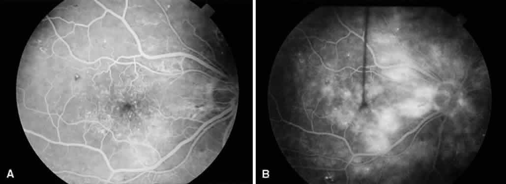 COMBINED TRACTION-RHEGMATOGENOUS RETINAL DETACHMENT Vitreous traction and contraction of proliferative tissue can produce retinal tears, leading to combined traction-rhegmatogenous detachments. Unlike purely tractional detachments, extramacular rhegmatogenous detachments frequently progress to involve the macula, leading to rapid and severe visual loss. Thus, surgical repair is indicated in combined detachments, whether or not the macula is involved. Often, the retinal breaks are located posterior to the equator, adjacent to areas of fibrovascular proliferation that are under severe vitreoretinal traction. Therefore, this condition is difficult to treat by conventional scleral buckling methods, whereas vitrectomy (with or without scleral buckling) is effective in treating this condition (Fig. 5). Intraocular long-acting gas tamponade is required to treat these detachments. Combined traction-rhegmatogenous detachments have a lower success rate than pure tractional detachments or nonclearing vitreous hemorrhage. In an analysis of 172 eyes that underwent vitrectomy for combined traction-rhegmatogenous diabetic retinal detachment, 48% had an improved visual acuity on final examination.21 A final visual acuity of 20/100 or better was achieved in only 25% of eyes, and a final visual acuity of 5/200 was achieved in 56%. Visual loss progressed to no light perception in 23% (compared with 19% for macular traction detachment and 6% for nonclearing vitreous hemorrhage). Preoperative factors associated with a favorable visual prognosis included visual acuity of 5/200 or better, absence of iris neovascularization, and absence of retinal detachment involving the macula. The only intraoperative factor found to be associated with a favorable visual prognosis was the absence of iatrogenic retinal breaks. PROGRESSIVE ACTIVE FIBROVASCULAR PROLIFERATION In most patients with PDR, panretinal photocoagulation induces regression of retinal and optic disc neovascularization. In some patients, however, fibrovascular proliferation progresses despite full panretinal photocoagulation treatment. The importance of vitreoretinal contact in the development of neovascular proliferation has been recognized since 1965.22 When the vitreous gel is removed, the proliferative process tends to stabilize. It is rare for neovascularization of the disc or posterior fundus to occur in eyes that have undergone complete vitrectomy. Since the natural history for eyes with severe fibrovascular proliferation is poor, the Diabetic Retinopathy Vitrectomy Study evaluated the role of vitrectomy in eyes with extensive, active neovascular or fibrovascular proliferation and useful vision (better than 10/200).23 Forty-four percent of eyes in the early vitrectomy group achieved a visual acuity of 10/20 or better, compared with 28% for the conventional management group. The greatest benefit was observed for eyes with severe fibrous proliferation and moderately severe neovascularization. Thus, for eyes with active, progressive, fibrovascular proliferation despite maximal panretinal photocoagulation, vitrectomy should be considered. However, vitrectomy does not take the place of panretinal photocoagulation and should be reserved only for eyes where laser cannot be applied or where laser has failed to stabilize the neovascular proliferation. MACULAR EDEMA ASSOCIATED WITH POSTERIOR HYALOIDAL TRACTION Although the ETDRS showed that focal macular photocoagulation is beneficial in the treatment of clinically significant diabetic macular edema, it has been observed that some patients with diabetic macular edema and a taut, thickened posterior hyaloid do not respond to macular photocoagulation. It has been hypothesized that vitreous traction may cause or exacerbate macular edema in these patients. Lewis and coauthors report the results of pars plana vitrectomy with separation of the posterior hyaloid in 10 eyes with diabetic macular edema and traction associated with a thickened and taut premacular posterior hyaloid.24 Preoperative fluorescein angiography showed a deep, diffuse pattern of leakage in the macula (Fig. 6). Nine of 10 eyes had previous macular photocoagulation, and only 1 of these eyes responded with a temporary decrease in macular edema. Postoperatively, vision improved in nine eyes, and macular edema resolved in eight eyes. Postoperative complications included vitreous hemorrhage, rhegmatogenous retinal detachment, cataract formation, and mild epimacular membrane (each occurring in one eye). Other studies also report visual improvement after vitrectomy and posterior hyaloid separation in such patients.25 Tachi and Ogino report the results of pars plana vitrectomy with separation of the posterior hyaloid in 58 eyes with diffuse diabetic macular edema without posterior vitreous detachment.26 These patients differed from those in prior reports in that they did not manifest a taut, thickened posterior hyaloid, and thus it is not clear whether the posterior hyaloid was responsible for the macular edema. Although these patients showed an improvement in macular edema and visual acuity, this study was not controlled and included only a few patients. Thus, it is reasonable to consider vitrectomy and posterior hyaloid separation in patients with diffuse diabetic macular edema associated with a taut and thickened posterior hyaloid, whereas the long-term efficacy of such surgery in patients with diabetic macular edema without vitreoretinal interface abnormalities has not been conclusively proven.