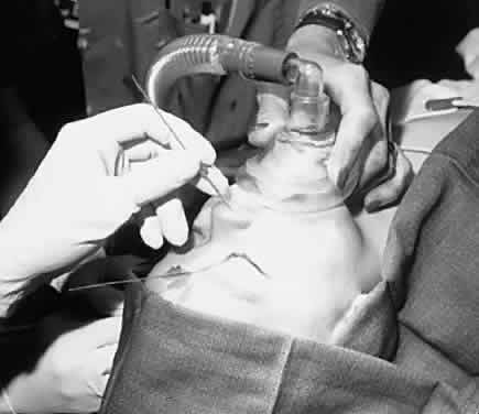 INDUCTION Induction of anesthesia may be through a mask with a potent inhalational agent (halothane, sevoflurane). A pleasant flavor may be applied to the mask with Chapstick to make the mask more acceptable to the child. Other induction methods include intravenous administration of 2.5% sodium thiopental (4 to 8 mg/kg), propofol (2 to 3 mg/kg), or rectal administration of methohexital sodium (20 to30 mg/kg). Intramuscular injection of ketamine (1 to 8 mg/kg) may facilitate induction but nystagmus is common and may make ocular surgery difficult. Light levels of anesthesia may produce poor operating conditions. Bradycardia with or without hypotension may occur during inhalation induction with halothane and is caused by the cardiac effect of halothane. This is less common with sevoflurane than halothane. Bradycardia is treated by administering atropine (10 to 20 μg/kg), intravenous fluids, intravenous calcium, or epinephrine, and discontinuing the anesthetic agent. Because intravenous medication can facilitate securing the airway and establishing cardiovascular stability, an intravenous catheter should be placed as soon as possible after the child is asleep. In children, veins in the lower extremities or scalp may be used in addition to those in the upper extremities. Intramuscular injection of ketamine is usually reserved for uncooperative children who have not been sedated adequately by premedication withmidazolam or for older children (15 to 20 years) who are unable to control themselves in the operating room setting (e.g., the severely mentally handicapped). Low-dose ketamine (1 to 3 mg/kg IM) may quiet the child sufficiently to accept intravenous or mask induction. Complications of intramuscular ketamine include a possible increase in intraocular pressure (IOP), increased secretions, loss of airway reflexes, airway obstruction, and postoperative hallucinations. Anticholinergic should be administered with ketamine to decrease secretions. INTUBATION Some surgical procedures can be performed without an endotracheal tube in place, such as examination under anesthesia or probe and irrigation of the nasolacrimal duct, especially if the procedure is brief (less than 5 minutes; Figs. 4 and 5). However, intubation with a properly sized endotracheal tube is a routine part of most procedures involving anesthetics, especially in younger patients undergoing surgery on the face, and this can be safely performed even for brief procedures. Intubation should be performed when the child is deeply anesthetized and has little muscular tone. Neuromuscular blocking drugs are optional. Common complications ofmask anesthesia include airway obstruction, laryngospasm, silent aspiration, and hypotension from deep anesthesia. Protecting the airway with a properly sized endotracheal tube can prevent most of these problems.