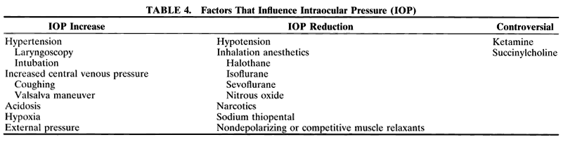 Most anesthetics and neuromuscular blocking drugs reduce IOP, with the possible exceptions of ketamine and succinylcholine. Ketamine has various effects; early studies showed an increase in IOP after intramuscular or intravenous administration of the drug. More recent studies have found that after premedication with diazepam and meperidine intramuscular administration of ketamine does not affect IOP, and sometimes it even lowered IOP in children. Succinylcholine causes a transient (4 to 6 minutes) increase of 10 to 20 mmHg in IOP. For this reason, use of succinylcholine in a rapid-sequence induction in a child with an open-globe injury is controversial. Whether IOP can be reduced with intravenous sodium thiopental and lidocaine, or administration of halothane by mask so that the effect of succinylcholine is not clinically significant is difficult to ascertain. Pretreatment with nondepolarizing neuromuscular blocking drugs before administration of succinylcholine does not consistently prevent this increase in IOP; however, no cases of loss of vitreous humor have been reported during administration of curare-barbiturate-succinylcholine. Alternatively, a nondepolarizing neuromuscular blocker with rapid onset such as rocuronium may be administered to facilitate intubation; however, the duration of paralysis is longer than with succinyl-choline. After muscle relaxation occurs, cricoid pressure is applied to compress the esophagus, to prevent aspiration of gastric contents during rapid sequence induction of anesthesia. If a mask induction with halothane is necessary in a pediatric patient, cricoid pressure should be used until intubation has been accomplished. Because laryngoscopy and intubation increase IOP, an appropriate depth of anesthesia must be achieved first to compensate for this increase. MALIGNANT HYPERTHERMIA Malignant hyperthermia is a life-threatening metabolic state that can be triggered by all potent inhalational anesthetics such as halothane or sevoflurane and by depolarizing neuromuscular blocking drugs such as succinylcholine. A pharmacogenetic defect exists in the skeletal muscle such that intracellular calcium increases after exposure to the trigger agents. This results in metabolic and respiratory acidosis, and rhabdomyolysis. Cerebral edema, cardiovascular collapse, and disseminated intravascular coagulation may follow. Incidence of malignant hyperthermia ranges from 1 in 4500 to 1 in 60,000 anesthesia cases, with a mortality rate of about 10%now that intraoperative capnography is standard, blood gas and electrolyte analysis is readily available to detect malignant hyperthermia and dantrolene can be administered quickly to treat it. Clinical signs include tachycardia, tachypnea, and increased end-tidal levels of carbon dioxide. Incidence of malignant hyperthermia may be increased in patients with underlying myopathy, such as central core disease. Masseter muscle rigidity has been thought to be an early sign of malignant hyperthermia. Early detection and proper treatment of malignant hyperthermia are crucial. When vital signs and exhaled carbon dioxide concentration suggest that the metabolic rate is increasing, blood from a large vein should be obtained for measurement of partial pressure of oxygen and carbon dioxide (pO2 and pCO2, respectively), acid-base status, and electrolytes. Symptomatic measures to support the circulation and maintain normal temperature should be undertaken including application of ice to highly perfused areas and infusion of cold fluid. If biochemical data support the presence of malignant hyperthermia (pCO2 above 60 mmHg, pH below 7.25 with a base deficit of a greater magnitude than -8, potassium over 6 mEq/L), then treatment with dantrolene should be initiated, exposure to the trigger agent stopped, and surgery concluded as rapidly as possible. Dantrolene should be immediately available in all inpatient and outpatient operating suites. More than 10 mg/kg may be needed to restore cardiovascular stability although the average dose needed is 2.5 mg/kg. Dantrolene works by decreasing calcium release from the sarcoplasmic reticulum. Mannitol is present in the formulation of dantrolene; therefore, an osmotic diuresis is expected. Insertion of a Foley catheter and measurement of myoglobin in the urine are advisable. After treatment for malignant hyperthermia is initiated, surgery should be rapidly concluded and the patient observed in an intensive care unit. Dantrolene1.0 mg/kg should be given every 6 hours for 24 to 48 hours until there is no evidence of ongoing rhabdomyolysis. Serum creatine phosphokinase (CK) levels should be measured every 12 hours until CK levels are stable after an episode of malignant hyperthermia. A consultation service is available 24 hours a day (1-800-MH-HYPER or 1-800-644-9737) sponsored by the Malignant Hyperthermia Association of the United States (MHAUS) to provide specialized advice in an emergency. In the past, if a child experienced masseter muscle rigidity on induction of anesthesia, surgery often was cancelled due to the fear of progression to malignant hyperthermia. This remains controversial. MASSETER MUSCLE RIGIDITY AND SPASM Masseter muscle rigidity (MMR) or tightening of the jaw muscle occurs after administration of succinylcholine. It may be an extreme form of the normal response to succinylcholine. A scale of gradation may be broken down as follows11: 1, complete relaxation, mandible falls open with head extension or pushing on chin; 2, incomplete relaxation, firm manual separation of teeth required to fully open the mouth; 3, MMR, mouth cannot be fully opened, intubation possible; 4, masseter spasm/trismus, mouth cannot be opened, teeth clamped shut (so-called jaw of steel), intubation impossible. If score 0 occurs, mask ventilation may be continued, but intubation cannot be performed due to inability to open the patient's mouth. Some patients with masseter stiffness of grade 3 or 4 have developed malignant
