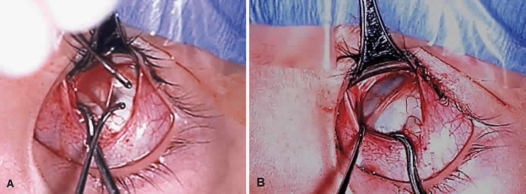 Fig. 16. A. Anterior 2 mm of the left superior oblique tendon are separated from the posterior tendon fiber using Stevens tenotomy hooks. Superior rectus muscle has been engaged on a Jameson muscle hook to hold eye in infraduction. B. Posterior superior oblique tendon fibers have been disinserted from the sclera and excised. Only the most anterior fibers remain intact.