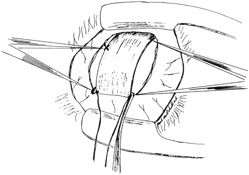 Cüppers1 described disinserting the muscle, placing two sutures though the sclera