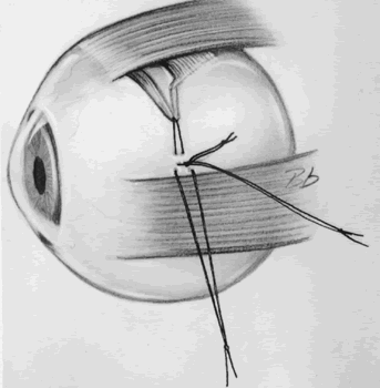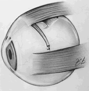 Both needles are then passed through the sclera at a point superior to the lateral rectus muscle, 6 to 8 mm posterior to its insertion, so as to pull the anterior portion toward that point (Fig. 5). In the Fells modification of the Harada-Ito procedure, the anterior half of the superior oblique tendon is disinserted and moved temporally and anteriorly, attaching it to the sclera near the superior border of the lateral rectus muscle17,18 (Fig. 6).
