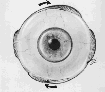 Our usual technique is an adjustable Harada-Ito procedure with a double-armed 6-0 Vicryl suture without disinserting the anterior portion of the superior oblique tendon (Fig. 7). An adjustable noose is tied around the sutures in a double loop followed by a square knot.19 A 5-0 Mersilene suture is also passed through partial-thickness sclera for retraction of conjunctiva during the postoperative adjustment. Intraoperative adjustment of torsion is made by comparing anatomic torsion with the indirect ophthalmoscope before and after tightening the anterior tendon fibers. Generally, we place the fovea level with the center of the disc, finding that this amount of initial overcorrection yields good long-term results. This is our only means of adjustment in children who would be uncooperative for later adjustment at the bedside. In older children and adults, postoperative adjustment of torsion at the bedside is performed using the Lancaster red-green test in various positions of gaze. In the case of bilateral superior oblique paresis, approximately 3 to 5 degrees of immediate postoperative intorsion in primary position is desirable, more in upgaze, and less in downgaze. Each noose is adjusted, and the ends tied accordingly. This purposeful overcorrection usually disappears in the weeks following surgery, except for a small amount of consecutive intorsion in upgaze that may persist. The Harada-Ito procedure is remarkably safe and effective, but there are several potential complications. First, although some intorsion in upgaze is usually required to achieve adequate torsional correction in downgaze, excessive intorsion in upgaze may be symptomatic. In addition, small vertical deviations may persist after bilateral Harada-Ito procedures. For this reason, we often put an adjustable suture on a vertical rectus muscle for postoperative modification. Finally, if the anterior portion of the superior oblique tendon is placed too far anteriorly, esotropia may be induced, especially in downgaze. HORIZONTAL TRANSPOSITION OF THE VERTICAL RECTUS MUSCLES The oblique muscles have the most torsional action in primary position, followed by the vertical rectus muscles, with essentially no torsional action from the horizontal rectus muscles. Therefore, in cases in which oblique surgery has failed and cannot be repeated, or an oblique muscle is congenitally absent, horizontal transposition of the vertical rectus muscles presents a viable alternative to oblique surgery for torsion20,21 (Fig. 8). Transposing the superior rectus muscle nasally has an extorting effect, whereas transposing it temporally has an intorting effect (Table 2). Likewise, transposing the inferior rectus muscle nasally has an intorting effect, whereas transposing it temporally has an extorting effect. Therefore, transposition of the superior rectus muscle or the opposite transposition of the antagonist inferior rectus muscle 5 to 9 mm can either correct or induce abnormal torsion. For cyclodeviations that are predominantly in downgaze,transposition of the inferior rectus muscle may be preferable. Conversely, superior rectus transposition may be preferable if torsional deviations are more evident in upgaze. Temporal transposition, in either case, is likely to be more effective than nasal transposition, because temporal transposition gives the muscle more of a torsional direction of action.