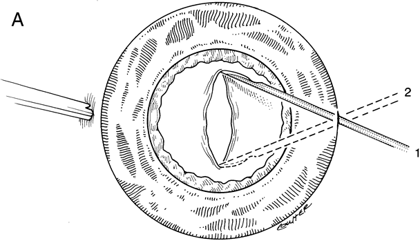 procedures required a second anesthetic to open the opacified lens capsule. When phacoemulsification became available, it was quickly applied to the removal of children's cataracts because it provided the surgeon with better control of the flow of irrigating solutions and provided improved control of the aspiration flow and pressure.4 The instrument also added a new capability, that of being able to mechanically disrupt the lens nucleus and cortex to facilitate aspiration of the lens. Although the phacoemulsification instrument was helpful for removing lens cortex, it was ineffective in cutting or removing the posterior lens capsule. At the conclusion of the phacoemulsification procedure, the posterior capsule was left intact. When capsular opacification occurred, it was treated with a discission procedure, an operation that consisted of making a cut in the posterior capsule with a bent needle, a Ziegler knife, or a modification of the latter (Fig. 1). If the membrane was thick and resisted opening with a knife, an intraocular scissors was necessary to open the lens capsule. In children, opacification of the posterior capsule of the lens and a subsequent decrease in vision will always occur if the posterior lens capsule is left intact. The terms posterior capsule fibrosis, secondary membrane, and Elschnig's pearls are used interchangeably to describe these changes. Opacification of the posterior capsule results from proliferation and migration of residual lens epithelial cells.5 In adults, the extent and rapidity of capsular opacification can be minimized by reducing surgical trauma, by removing as many of the posterior lens capsule epithelial cells as possible by polishing the posterior capsule, and by selecting implants that reduce posterior capsule opacification.6–9 In children, even when these measures are taken, the lens epithelial cells rapidly proliferate. If a posterior capsulotomy is not performed, or if only a small opening in the capsule is made, the posterior capsule will opacify within weeks to months. The vitreous face is considered to serve as a scaffold for migration of the lens epithelial cells. However, even when this is disrupted with an anterior vitrectomy, the lens material can opacify the visual axis.10–11 Opacification of the posterior lens capsule causes difficulty in the visual habilitative process because it reduces the accuracy of retinoscopy and will cause light entering the eye to be diffracted. These factors will impede visual development and will make management of amblyopia difficult. The advantage of leaving the posterior capsule of the lens intact after cataract surgery is that it retains a barrier between the anterior chamber and vitreous. This prevents the vitreous from entering the anterior chamber, and it theoretically preserves the ocular anatomic relationships after cataract surgery. The disadvantage of leaving the posterior lens capsule intact is that when the capsule opacifies, a second procedure is needed to re-establish a clear visual axis. To achieve this, a second anesthetic is administered and an incision is made into the clear cornea. The chamber is deepened with a viscoelastic material and a knife or other instruments are introduced into the anterior chamber to cut or tear the posterior capsule so that the visual axis can be cleared (Fig. 1). When the vitreous suction-cutting devices became available, they were quickly employed to remove cataracts in children. In addition to providing control of aspiration pressure and control of the flow of irrigation solutions, they also added the ability to remove some or all of the posterior lens capsule, even when the capsule had a thick fibrovascular stalk associated with persistent hyperplastic primary vitreous (PHPV) or a thick capsular plaque (Fig. 2). These fine-tip suction-cutting instruments provided sufficient control of the anterior chamber depth, thus permitting the surgeon to precisely open the posterior capsule and, if necessary, safely remove vitreous from the anterior chamber. Keech and co-workers,12 in a contemporaneous surgical series, showed that having the ability to remove the posterior lens capsule and perform an anterior vitrectomy reduced the need for secondary procedures from 75%, if the capsule was left intact, to 11% after capsulectomy and anterior vitrectomy. They found that when a large section of the posterior lens capsule was removed, it provided a lasting optical opening and reduced the requirement for additional surgery. As techniques evolved, concerns were raised about the wisdom of removing a portion of the anterior vitreous with the capsulectomy. Occasional reports postulated that cystoid macular edema may occur with these techniques, but the actual risk of developing cystoid macular edema and the long-term results of an anterior vitrectomy on the eye of a child (and in particular on the retina) remain unknown.13 This relatively new capability of safely removing a portion of the lens capsule, or even the entire posterior lens capsule, gave rise to controversy. If only a small portion of the posterior capsule was removed, opacification could recur. Experience showed that the lens would develop pearls at the edge of the posterior capsulotomy, and these lens epithelial cells could migrate across a scaffold created by the anterior vitreous face. If the entire posterior lens capsule was removed, recurrence of posterior capsule opacification would usually not occur, but the barrier effect of the posterior lens capsule between the anterior chamber and vitreous was lost. In 1981, Taylor, and later, Parks14–15 reviewed these issues and concluded that it was best to remove the posterior lens capsule and combine this with a small anterior vitrectomy. It was considered that the risk of developing cystoid macular edema was relatively remote and unproved. There was a greater risk of decreased vision if the capsule became opaque and amblyopia became refractory to treatment. Fo