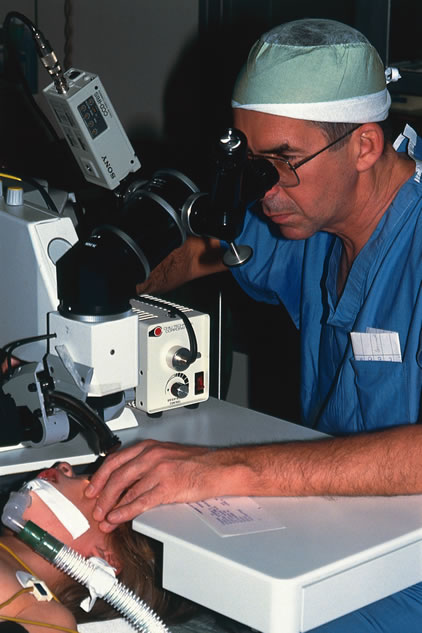 Until recently, application of laser technology for young or uncooperative children has been difficult because the instrumentation is bulky and difficult to transport. To some extent, these problems have been reduced with a reduction in the size of the laser. Use of the Nd:YAG laser to open the posterior lens capsule in young children has required that the patient be treated in a seated position. If the child is young or uncooperative, some surgeons have resorted to anesthetizing the child near the location of the Nd:YAG laser and have performed the laser treatment on the child while he or she is held in position for use of the laser delivery device. With this technique, there can be problems with positioning the eye, and if the child is treated at a location that is remote from the operating room, there may be difficulty in monitoring the child's anesthetic and providing emergency treatment if this would be required. To overcome these difficulties, the Nd:YAG laser has been modified so that a posterior capsulotomy can be performed on a child in the supine position. The laser delivery systems now provide the surgeon with the ability to safely perform an Nd:YAG laser capsulotomy in children in the operating room with the assistance of sedation or, if necessary, general anesthesia (Fig. 4). In 1994, Atkinson and Hiles demonstrated the effectiveness of the Nd:YAG laser in children 3 months of age and older.29 The surgeon may elect to perform the Nd:YAG capsulotomy immediately after cataract surgery or at a later date, when the capsule has become tense or has begun to opacify.