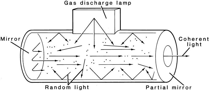 The term laser is an acronym that stands for “light amplification by a stimulated emission of radiation.” In 1917, Einstein postulated that a photon released from an excited atom could, upon interacting with a second similarly excited atom, trigger a second atom to be excited and release a photon. The photon released by the second atom would be identical in frequency, energy, direction, and phase to the triggering photon. These two photons could then proceed to trigger more atoms, causing an excited state or stimulated emission. Stimulated emission is achieved by “pumping” energy into a lasing medium. This is accomplished in the Nd:YAG by use of a gas discharge lamp. When an appropriate medium contains a great many excited atoms, the emission of light output will be randomized and equal in all directions. Once stimulated radiation is achieved, the energy can be given a preferential direction by placing a fully mirrored surface at one end of the optics cavity and a partial mirror at the opposite end (Fig. 5). The light energy reflected between these two mirrors collides with other excited atoms, causing more photons to be released and emit more light energy. The energy that escapes through the partial mirror is said to be coherent, which means that it has only one orientation or polarization. Other random light produced is trapped within the laser medium. The stimulated emission can be collimated and focused by a laser delivery system.