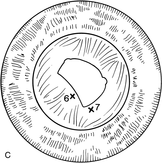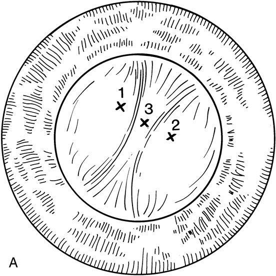 If the capsule is thin, the laser is used to create a vertical opening using 10 to 25 applications (Fig. 14). This is usually enough to create a sufficient opening. As shown by Capone and co-workers,31 it is not necessary to create a round capsulotomy. The posterior capsule will retract and increase the area of the opening, with a tendency toward sphericity. Attempts should be made to create an opening at least 4.5 to 5 mm in size. When the capsular membrane is thick, or if it does not look as though it will retract, the laser should be used to create either a triangular or a cruciate opening beginning at the 12 o'clock position and progressing down to the 5 o'clock and 7 o'clock positions (Fig. 15). This technique creates a flap that will usually roll posterior and provide a sufficient opening. Attempts should be made to avoid creating a free-floating fragment of lens capsule. Children who have undergone a capsulotomy and anterior vitrectomy may be left with an irregular pupil or one that encroaches upon the visual axis in one meridian. The Nd:YAG laser can be useful in cutting discrete adhesions between the iris and the posterior capsule. Care should be taken to identify any blood vessels when cutting membranes. Cutting a blood vessel with the Nd:YAG laser can cause bleeding in the anterior chamber. When this occurs, the bleeding usually stops spontaneously. If it does not, application of gentle pressure on the contact lens will raise the intraocular pressure and decrease the rate of hemorrhage. Bleeding may occur to such an extent that the anterior chamber becomes turbid and visualization becomes difficult.