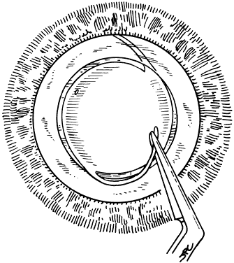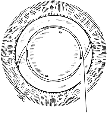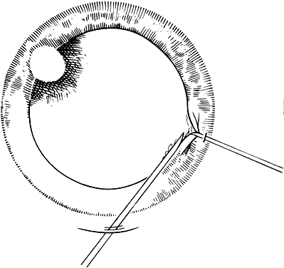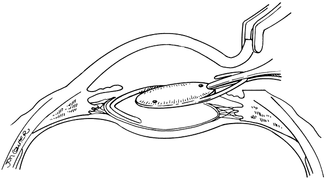 A peripheral iridectomy is performed in all patients as an added safety precaution and viscoelastic is removed before the wound is closed. In older children able to cooperate at the slit lamp microscope for suture removal, the wound is closed with interrupted 10-0 nylon sutures; suture removal is planned for 5 to 6 weeks after surgery. In young or uncooperative children, the sutures may be removed with an examination under anesthesia, also affording the opportunity for detailed examination of the eye, or interrupted 9-0 Polyglactin absorbable sutures may be used. The activity level of the young patient and possible eye rubbing are kept in mind during wound closure, and extra sutures are placed for added strength if there is any question about the integrity of the wound. A decision must then be made regarding the posterior capsule, PC opacification after extracapsular cataract surgery is caused by proliferation and migration of residual lens epithelial cells.42 This occurs as an age-related tendency, and virtually all pediatric patients develop capsular opacification over time.43 In an infant less than 1 year of age this may occur within the first several postoperative weeks. In an older child, opacification may take years to develop. One study of IOL use in children reported an average time to opacification of 2 years, regardless of patient age at the time of surgery and suggested primary capsulectomy-anterior vitrectomy at the time of implant surgery for children who are not expected to be candidates for YAG capsulotomy within 18 months of surgery.44 In patients less than 2 years of age, the risk of developing a thick membrane on which it would be difficult to perform YAG capsulotomy is significant and all these patients should have primary posterior capsulotomy-anterior vitrectomy procedures performed. If the patient can be expected to be cooperative enough for subsequent Nd:YAG laser capsulotomy, or if the facilities are available for performing YAG laser procedures on supine anesthetized patients, the capsule is left intact to avoid the potential complications of intraocular capsulotomy. It should be emphasized here that if this is the strategy taken, YAG capsulotomy must be performed in a timely fashion to avoid problems with amblyopia induced by the visual deprivation of capsular opacification and to prevent development of a thick membrane that may be resistant to YAG laser disruption using a reasonable amount of energy. If posterior capsulectomy-anterior vitrectomy is to be performed at the time of implant surgery, after the implant wound is closed, a vitreous cutting instrument is used from the pars plana, posterior to the posterior capsule and IOL.45 An infusion cannula is placed into the AC and a stab incision is made for the cutting instrument 1.5 to 2 mm posterior to the limbus. A central posterior capsulectomy is then made with removal of the anterior vitreous. Generous vitrectomy should be performed in infants and young children. SECONDARY PC IOL IMPLANTATION Capsular Support Present If the cataract surgery has been performed, leaving a rim of capsule present, secondary implantation of a PC IOL into the ciliary sulcus is then performed. The anterior and posterior capsular flaps having sealed together will thus form a so-called shelf to help guide and support the haptics in the ciliary sulcus.46,47 Preoperative evaluation of pupillary dilation, the integrity of this capsular shelf, and examination for iridocapsular synechiae are important. If pupillary dilation is seen to be poor or if synechiae are present, a paracentesis tract should be planned. An iris or Sinskey hook is used for retraction of the iris to aid in examination of the iridocapsular relationships. Synechiae may be lysed with viscoelastic, an iris spatula, or, frequently, they may need to be cut with a discission knife (Fig. 6). A technique for in-the-bag secondary IOL implantation is selected patients has been described by Wilson and coworkers.48 In this technique, if Sommering's ring is present, with a ring of reproliferated cortex present between the lens equator and the fused anterior and posterior capsular leaflets, the capsular bag may be reopened to allow placement of the haptics within the bag. Those authors suggest limiting the anterior and posterior capsulectomy performed during the initial cataract surgery to a smaller than usual 4 to 5 mm and the performance of generous anterior vitrectomy to aid in preventing closure of the capsulectomy. The success of this technique in reliably producing the required capsular conditions without producing problems with synechiae or secondary membranes has not yet been demonstrated. Capsular Support Absent Several techniques have been advocated for suture fixation of PC IOLs into the ciliary sulcus since the concept was first described by Girard.34,35,46–59 Important improvements are the use of an implant with holes at the apex of each haptic to make fixation of the sutures to the haptics easier and less likely to malposition, and incorporation of conjunctival-scleral flaps to sequester the suture knot to prevent erosion and the increased possibility of endophthalmitis. Fixation of the haptics at slightly oblique meridians helps avoid the major arterial vessels of the iris and ciliary body and also decreases the chances for hemorrhage with the passage of the fixation sutures.24 SECONDARY AC IOL IMPLANTATION Secondary AC IOL implantation in pediatric patients is performed in the same manner as that used in adults. There may be some advantage to a horizontal orientation of the haptics over a vertical orientation. If a peripheral iridectomy is present superiorly, horizontal orientation avoids it. There is also some suggestion that chronic discomfort after AC IOL implantation, particularly if too large a lensis implanted, may be avoided with horizontal placement. |