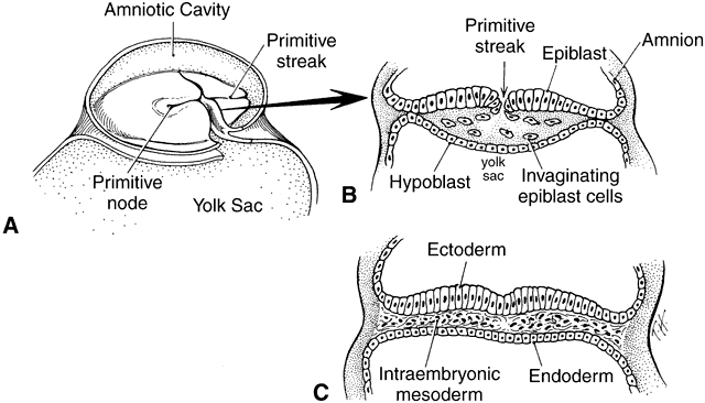 for many ocular malformations that occur in humans. Gastrulation (formation of the mesodermal germ layer) occurs early in gestation (day 7 in mice, day 20 in humans). The primitive streak forms as a longitudinal groove within the epiblast (future ectoderm) of the bilaminar embryonic disc. Epiblast cells migrate medially toward the primitive streak where they invaginate to form the mesodermal layer (Fig. 1). This forms the classic three germ layers: ectoderm, mesoderm, and endoderm. Gastrulation progresses in a cranial to caudal direction. Concurrently, cranial surface ectoderm proliferates forming bilateral elevations called neural folds (Fig. 2). Columnar surface ectoderm in this area now becomes neural ectoderm. Experimental studies in mice using acute exposure to teratogens have demonstrated the significance of the period of gastrulation to later ocular development. Exposure to ethanol or retinoic acid during a short period equivalent to the third week of human gestation causes primary damage to the forebrain neural ectoderm.22–24 This results in a spectrum of malformations including microphthalmia, anterior segment dysgenesis (Peters' anomaly), iris and optic nerve colobomas, and persistent hyperplastic primary vitreous.25,26 As the neural folds elevate and approach each other (neurulation), a specialized population of mesenchymal cells, the neural crest, emigrates from the neural ectoderm at its junction with the surface ectoderm. In the development of the eye, the neural ectoderm (deriving from the neural plate and neural folds), the surface ectoderm, the neural crest, and, to a lesser extent, the mesoderm are of importance (Table 1).