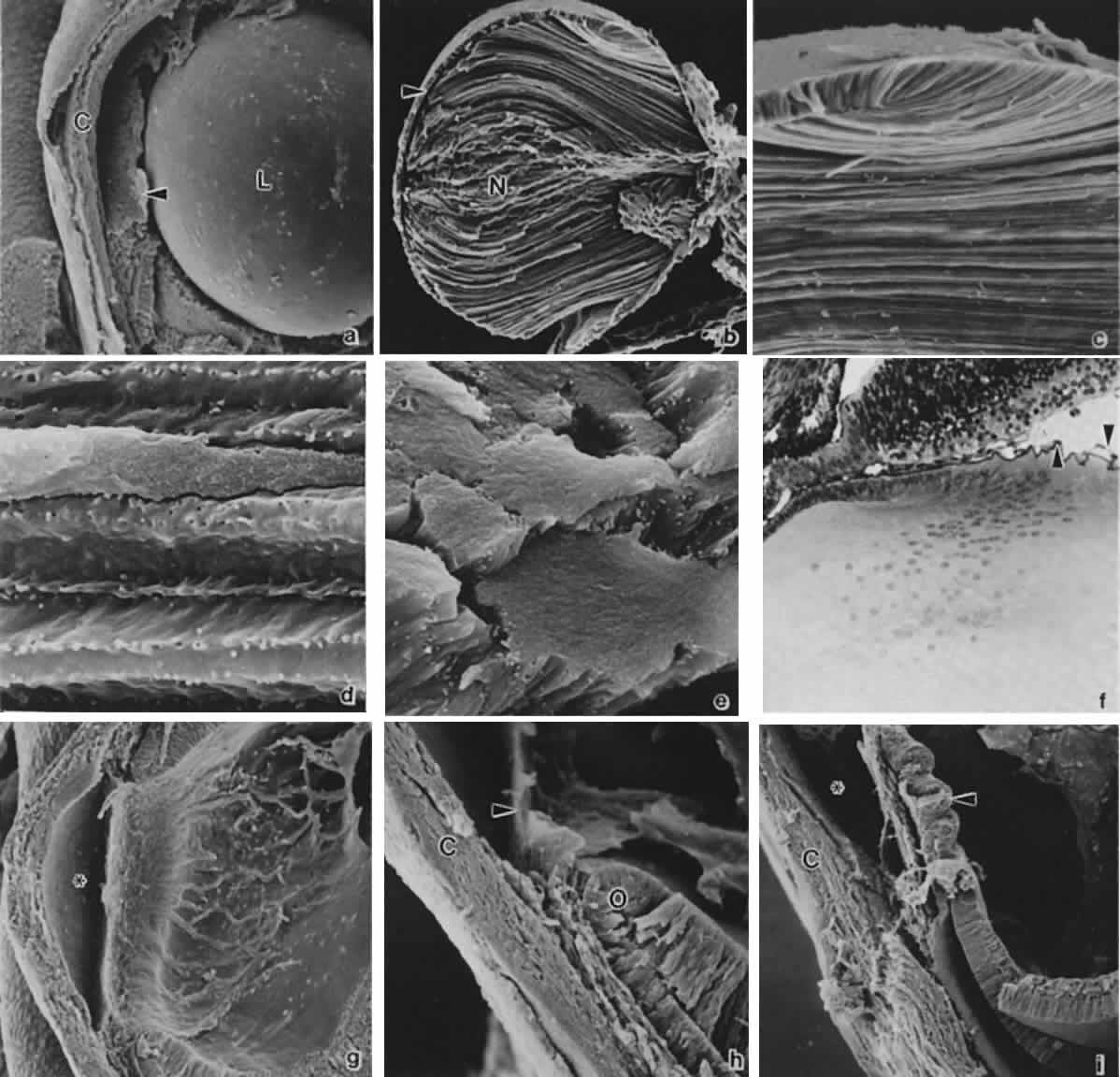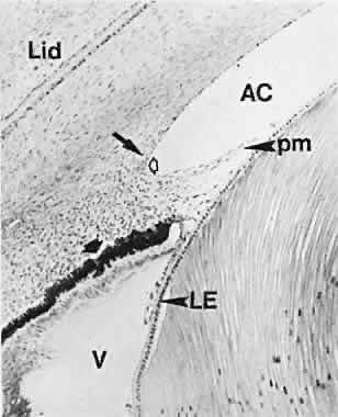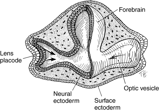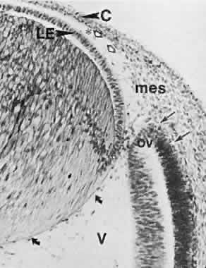 disc-shaped thickening of surface epithelial cells (27 days' gestation) (see Figs. 5B, 6, and 9A and B). A tight, extracellular matrix-mediated adhesion between the optic vesicle