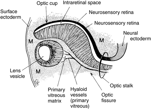 The optic vesicle and optic stalk invaginate through differential growth and infolding. Local apical contraction52 and physiologic cell death53 have been identified during invagination. This process progresses from inferior to superior so that the sides of the optic cup and stalk meet inferiorly in the optic fissure. The two lips of the optic fissure meet and initially fuse anterior to the optic stalk with fusion progressing anteriorly and posteriorly. Failure of normal closure of this fissure may result in inferiorly located defects (colobomas) in the iris, choroid, or optic nerve. Closure of the optic cup through fusion of the optic fissure allows establishment of intraocular pressure. Studies have demonstrated that, in the chick, the protein in the embryonic vitreous humor is derived from plasma proteins entering the eye by diffusion out of permeable vessels in the anterior segment.54 After optic fissure closure, protein content in the vitreous decreases, possibly through dilution by aqueous humor produced by developing ciliary epithelium. Table 2 lists the chronologic sequence of ocular development and comparative body-eye measurements in relationship to embryonic time intervals.