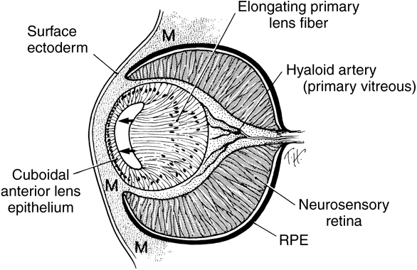 system and its regression.203–215 PRIMARY VITREOUS Hyaloid Vasculature The primary vitreous mostly consists of the hyaloid vasculature with some minimal associated matrix and cellular (neural crest) components. Vascular endothelia are of mesodermal origin. The matrix may be a combined secretion of the vascular and neural crest tissue. The primitive dorsal ophthalmic artery gives off the hyaloid artery, which passes through the optic fissure during the fifth week of gestation (see Fig. 33) and branches within the cavity of the primary optic vesicle (Fig. 36A; see Fig. 9A). Arborization of the hyaloid artery produces terminal branches around the posterior lens capsule (the tunica vasculosa lentis). Other branches surround the lens equator and anastomose with the annular vessel around the outer edge of the optic cup (see Fig. 36B). The annular vessel sends loops forward and centrally, which compose the anterior tunica vasculosa lentis. Near the margins of the cup, anastomoses occur between the annular vessel and terminal branches of the hyaloid artery. The hyaloid vasculature reaches its greatest development at about 9 weeks (33 to 40 mm; see Fig. 36B). Venous drainage from the vessels of the tunica vasculosa lentis and the pupillary membrane is accomplished through vessels that assemble into a net in the region where the ciliary body will subsequently arise. This plexus eventually communicates with venules of the choroid. No hyaloid vein is present. SECONDARY (DEFINITIVE) VITREOUS Development of secondary vitreous occurs during the seventh to eighth weeks, after closure of the optic fissure. A finer, more compact fibrillar network of monocytes and a small amount of hyaluronic acid characterize it.203–208,213,215,216 This newer vitreous also contains cells, the primitive hyalocytes, which most likely originate from the vascular primary vitreous (mesoderm) and the neural crest mesenchyme, rather than the retina. Collagen fibrils are produced by the hyalocytes and result in expansion of the secondary vitreous volume. Vessel walls of the hyaloid system consist of endothelial cells with a discontinuous mural cell covering.210,211 The nonfenestrated endothelium is underlined by a continuous basal lamina. Expansion of the vitreous is associated with an overall increase in the volume of the globe through active production of aqueous humor.54 Failure of closure of the optic fissure prevents this normal establishment of intraocular pressure necessary for globe expansion. This is one mechanism of (colobomatous) microphthalmia. REGRESSION OF HYALOID VASCULATURE Beginning first with the atrophy of the distal branches of the hyaloid, followed by that of the capillaries of the tunica vasculosa lentis, and finally by that of the hyaloid artery itself (at end of the fourth month), the primary vitreous retracts with the atrophying vessels (see Fig. 36C). By 160 mm (in the fifth month), atrophy of the vasculature posterior to the lens creates the funnel-like expansion of Cloquet's canal. Before the capillaries disappear, they are occluded by macrophages.217 Persistence of the primary vitreous and failure of the posterior tunica vasculosa lentis to regress results in persistent hyperplastic primary vitreous (PHPV).214,218,219 TERTIARY VITREOUS AND ZONULAR FIBERS The secondary vitreous in the anterior peripheral region at the rim of the cup contains thicker, presumably aggregated collagen fibers. Some of these fibers abut the proliferating mesenchyme near and between the lens and the rim of the cup by the end of the third month (65 mm). These fibers form the marginal bundle of Drualt (Fig. 37; see Figs. 21, 22, 24, and 36C). Here, the vitreous is firmly attached to the internal limiting membrane of the retina. This constitutes the embryonic aspect of the vitreous base.