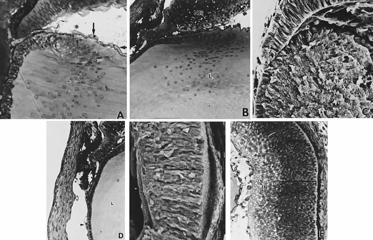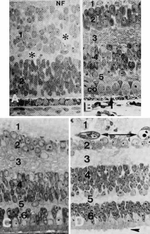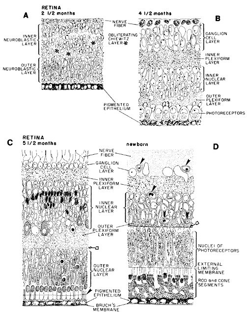 RETINA Retinal morphogenesis in humans and other species has been the subject of many investigations.139–158 Early Differentiation The primordium of the retina is present at the optic pit stage early during the third week of gestation even before closure of the neural tube (see Fig. 4A and B). The anterior part of the optic vesicle, the retinal disc, is the future neural retina, and has a marginal nonnucleated layer in contact with the lens placode. The sides of the invaginating vesicle are destined to become the pigment epithelium (see Fig. 9C and D). Following vesicle invagination to form the optic cup, the inner layer has an outer nuclear zone and an inner anuclear marginal zone. The outermost layer of cells of the nuclear zone (the germinating, or proliferative layer) projects cilia to the surface of the contacting outer layer, or future pigment epithelium. These cilia disappear during the seventh week. They are replaced by the precursors of the photoreceptor outer segments during the fourth month. The outer layer of the cup has two to three layers of pseudostratified columnar cells that enclose pigment granules at 33 days' gestation (7 to 9 mm). This layer produces the earliest pigmentation in the body. Punctate tight junctions near their apical ends join the cells. The basal lamina that originally surrounded the optic vesicle remains continuous over the inner (vitreal) and outer surfaces of the optic cup. The primitive retinal cells rest on a basement membrane that faces the inner future vitreal aspect and extend their apices toward the pigmented epithelial cells. In general, mitotic figures occur in the outer zone and prevail longest in the outer surface layer adjacent to the space representing the remnant of the primary optic cavity; and at the margin of the optic cup (future ciliary body-iris region). Mitosis first ceases in the central area; growth goes on longer in the periphery. Most cell division in the presumptive retina occurs before 120 mm (approximately 15 weeks). It is not established when mitosis ceases in the pigment epithelium. It is probably limited to the periphery in late fetal life. Formation of Layers Retinal differentiation commences when mitosis has practically stopped. It spreads from areas facing the future vitreous (marginal zone) toward the primary optic cavity, and from the center of the base of the optic cup (inner neuroblastic layer) toward its edge.159 Retinal ganglion cells and Müller's cells generally develop almost simultaneously. Here also, however, a gradient exists, given that axons and dendrites of ganglion cells near the optic nervehead differentiate earlier than those situated at the periphery. By proliferation and migration of cells, the neural epithelium separates into inner and outer neuroblastic layers in the seventh week of gestation (13 to 17 mm; see Fig. 11E and F). A few days later, a definite narrow nerve fiber layer is established, occasionally traversed by the radial fibers of the Müller cells. Immature ganglion cell bodies move into the inner neuroblastic layer along with other less mature cells, presumably future amacrines, creating in their wake a nuclei-free entanglement of processes, the transient fiber layer of Chievitz (Figs. 29A and 30A). With further realignment of cells, this layer is mostly obliterated by 8 to 10 weeks' gestation. At this period, the cells of the inner and outer neuroblastic layers intermingle by means of their cytoplasmic extensions. They fill up the previously acellular Chievitz layer; cell bodies shift positions, establishing a new, comparatively cell-free zone of intertwined processes, the inner plexiform layer (50 to 55 mm, approximately 10.5 weeks) (see Figs. 29B and 30B). With the emergence of the inner plexiform layer, an inner nucleated layer, consisting mostly of the cell bodies of ganglion cells, becomes separated from an outer neuroblastic zone. The cell bodies of the Müller's cells and the developing amacrines are located near the inner border of the outer neuroblastic zone. Bipolar cells differentiate mostly from the middle portion of this outer zone, whereas horizontal cells and photoreceptors arise from its outermost region (see Fig. 29B and C, and Fig. 30B and C). These developmental processes are well under way by 10 weeks to 12 weeks (approximately 60 to 80 mm), when an identifiable outer plexiform layer separates the immature horizontal and bipolar cell nuclei from those of the photoreceptors. Synaptogenesis precedes development of photoreceptor inner and outer segments by almost 2 months. Lamellar synapses start to form early in the fourth month in cone axons and bipolar terminals, as well as conventional synaptic complexes associated with amacrine cells; when these phenomena are operable, the cells are still immature. The newborn's retina has configuration and layers of the adult's. The photoreceptor outer segments are well developed and in contact with the pigment epithelium. Synapses of the outer plexiform layer are apparent (see Figs. 29D and 30D). Early in retinal morphogenesis, limiting membranes are established. Junctions of the zonula adherens type, representing the external limiting membrane of the retina are present in the fifth week between the outer plasma membranes of adjacent neuroblasts. A thin basal lamina exists over the inner surface of the marginal layer even before the lens vesicle formation. Contribution of basal laminalike material from developing Müller's cell processes combines with it to form the primitive internal limiting membrane. Photoreceptors The first indication of inner segment differentiation is the appearance of cilia in the outer cells of the external nuclear layer of the 10-week-old fetus. Later, the cell membrane becomes involuted, envelops the centriole, and forms a cylindric cytoplasmic process facing the apical portion of the developing pigment epithelium. Outer segment formation commences at 5 months. Outer segments start to develop when