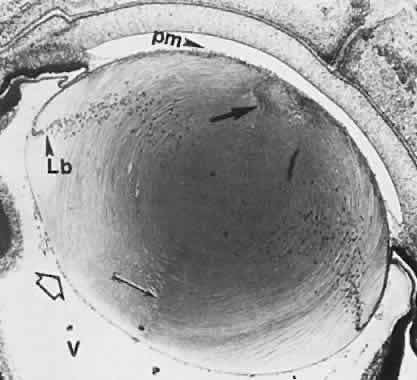 have been studied in detail.61–71 As the lens placode invaginates, it forms a hollow vesicle (see Figs. 8 and 9D). The area of contact of the optic vesicle and the surface ectoderm determines the size of the lens vesicle, orbit, and palpebral fissure. The lens separates from the surface epithelium at about 33 days' gestation (7 to 9 mm; see Fig. 9D). The vesicle consists of a single layer of cells, covered by a basal lamina. Through appositional growth to its epithelial surface, the basal lamina acquires more layers that become the lens capsule. At first, the posterior capsule is more prominent than the anterior; the outer layers may have components from the mesodermal tissues forming the hyaloid vascular network.72 A zone of necrosis develops, displacing the lens placode from the surface ectoderm (see Fig. 9E and F). The process of lens vesicle detachment is accompanied by active migration of epithelial cells out of the keratolenticular stalk, cellular necrosis, and basement membrane breakdown.73,74 Cup formation is achieved by contraction of the apical filaments. The process of induction is thus localized. PRIMARY LENS FIBERS The hollow lens vesicle consists of a single layer of epithelial cells with cell apices directed toward the center. Following detachment from the surface ectoderm, the lens vesicle is surrounded by a basal lamina, the future lens capsule. The cells lengthen (Figs. 10 and 11A) until the lumen of the vesicle is filled (45 days, 17 mm). These constitute the primary lens fibers. The apical ends of the newly formed fibers become firmly attached to the apical surface of the anterior lens epithelium. The retinal anlage promotes primary lens fiber formation in the adjacent lens epithelial cells. Surgical rotation of the lens vesicle in the chick's eye by 180 degrees results in elongation of the lens epithelial cells nearest the presumptive retina, regardless of the orientation of the transplanted lens.56 The retina thus develops independently from the lens, while the lens appears to rely on the retina for cytodifferentiation. This transformation of primary lens fibers is accompanied by ultrastructural changes in the nucleus and cytoplasm, decreased numbers of organelles, and increased numbers of fibrillar materials composed of the characteristic lens proteins.71 The primitive lens filled with primary lens fibers forms the embryonal nucleus, visible in the adult. This portion of the lens lacks sutures. SECONDARY LENS FIBERS The cells nearest the corneal primordium remain cuboidal and become the lens epithelium, which remains mitotic throughout life, giving rise to future lens fiber cells. Production of the secondary lens fibers is initiated by migration of the anterior epithelial cells toward the equator and their elongation at various degrees with a shift in their nuclear distribution, thus resulting in the lens bow (Fig. 12B, C, and F, and 13; see Figs. 11B and C). The basal ends of the fibers remain tightly attached to the basal lamina; their apical ends extend anteriorly to the center, thus forming the anterior suture. The tips of these secondary fibers are not yet tapered. A corresponding increase in cell volume and decrease in intercellular space within the lens accompany lens fiber elongation.61 The lens fibers exhibit surface interdigitations. They extend around the primary fibers beneath the capsule and meet in planes, the lens sutures, arranged essentially vertically to the surface. The basic anatomy of the lens is established after the first layer of secondary fibers has been placed (seventh week of gestation).75 LENS SUTURES Succeeding generations of cells extend anteriorly and posteriorly from the equator beneath the capsule. The anterior suture line is shaped like a Y that is inverted in the posterior aspect. The posterior suture is formed when the posterior central cells lose their nuclei, become separated from their basal lamina, and migrate inward.66 Curved lens fibers result, with the superficial ones being the longest. Linear and triradiate sutures form, representing different stages in lens development. MATURATION The shape of the lens and its orientation with respect to the optic axis continually adjust to the developing eye. This is partly regulated by the neural retina and peripheral mesenchyme.10 Through the third month of gestation, the anteroposterior diameter is greater than the equatorial. Mainly because of the continued generation of secondary fibers, the equatorial diameter increases rapidly, thus making the lens more and more ellipsoid. The lens, still somewhat spherical at birth, grows throughout life. A general structural densification occurs progressively during maturation. Fibrillar material is increased within the cytoplasm and cell organelles are decreased. The successive parallel layers of interdigitating, elongated lens fibers become tightly apposed (see Fig. 12D and E). Deeper nuclei become homogenous and dense. By the end of the third month, the innermost cells have lost their nuclei and simultaneously show disintegration of the chromatin and the ribosomes, leaving a finely filamentous cytoplasm. |