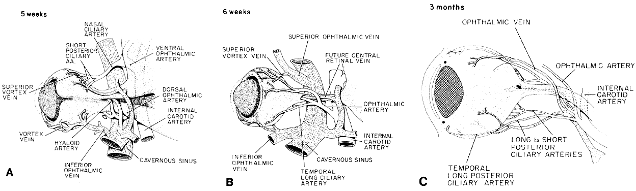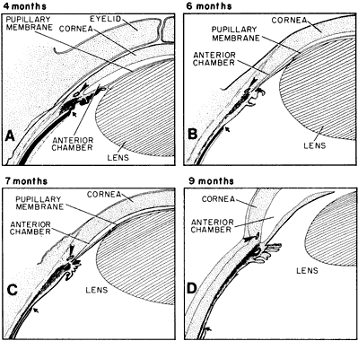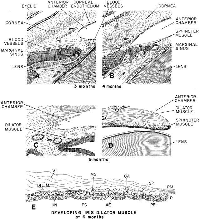 of the optic cup are oriented apex to apex. A thin basement membrane lines the inner (vitreous) aspect of the nonpigmented epithelium and retina. Apical cilia projecting into the intercellular space are seen at 4.5 months. There is also increased prominence of Golgi complexes and associated vesicles within the ciliary epithelial cells. These changes and the presence of “ciliary channels” between apical surfaces probably represent the first production of aqueous humor.121 IRIS The iris develops by anterior growth of the optic cup. The iris stroma develops from the same population of mesenchyme (neural crest) that forms the corneal stroma, corneal endothelium, and pupillary membrane. The neuroectoderm of the optic cup differentiates into the pupillary sphincter and dilator muscles and posterior iris epithelium and induces differentiation of iris stroma. Closure of the optic fissure is normally completed by 33 to 35 days' gestation. Failure of fusion of the fissure may result in an inferior (typical) iris coloboma alone or with iris hypoplasia. Tunica Vasculosa Lentis, Pupillary Membrane, and Iris Stroma In the 17 to 18 mm embryo (7th week), vascular outgrowths are seen extending from the rim of the optic cup over the anterior lens surface (see Fig. 16). Mesenchyme migrating into the space between the lens epithelium and corneal endothelium becomes the pupillary membrane during the eighth week (21 to 26 mm; see Fig. 12A, G, and H, and Figs. 16 and 18).81 The anterior chamber is then bounded anteriorly by the avascular corneal endothelium and posteriorly toward the lens by a thin, vascularized mesenchyme, the anterior portion of the tunica vasculosa lentis. The anterior tunica vasculosa lentis is continuous with the pupillary membrane, which is supplied by means of branches of the long posterior ciliary arteries and the major arterial circle (54 to 75 mm; Figs. 21 to 23). By the end of the third month, there is a rapid forward growth of both walls of the optic cup between the folded region and its margin (see Fig. 17A and B and Fig. 22). During the fifth month, a series of loops of vascular arcades reach centrally into the mesenchyme of the growing iris (see Fig. 23). These originate from branches of the long ciliary arteries. Immature tight junctions unite endothelial walls of the iris vasculature as soon as they are formed; there are no fenestrations.122 The arteriovenous loops of the pupillary membrane come to be arranged over the sphincter region and are the basis for the formation of the collarette. During the sixth month there is resorption of the axial (pupillary) portion of the pupillary membrane with subsequent atrophy of the blood vessels. The rest of the pupillary membrane disappears during the seventh and eighth month, not so much by dissolution as by remodeling of its constituents. The mesenchymal frame of the pupillary membrane is incorporated into the prospective iris stroma. Programmed cell death and phagocytosis by macrophages are involved in regression of the pupillary membrane. Dysfunction of any of these processes may play a role in the persistence of the pupillary membrane.123,124 Neuroectodermal Constituents of the Iris The inner layer of anterior portion of the optic cup differentiates into the posterior iris epithelium (continuation of the nonpigmented ciliary epithelium; Fig. 24). Pigmentation proceeds gradually from the pupillary margin, beginning at midterm (Fig. 25), toward the ciliary region and is completed during the seventh month. The smooth muscles of the pupillary sphincter and dilator muscles represent the only muscles in the body of neural ectodermal origin. In avian species, however, the pupillary muscles are striated and originate from stromal mesenchymal (neural crest) cells that migrate into the muscle bundles to become skeletal muscle cells.125 The first sign of differentiation of the sphincter muscle is the appearance of basal infoldings in the anterior epithelial layer (continuation of pigment epithelium) near the rim of the optic cup (see Figs. 17B and 25). This change is followed by reduced melanogenesis. At 3 months' gestation, fine fibrillar material is present in the basal part of these cells. In the sixth month, connective tissue septa and capillaries invade the muscle bundles and separate them from their origin, except at the pupillary edge. The muscle comes to lie free in the posterior mesenchymal layer (see Fig. 17D).126,127 The dilator muscle develops later than the sphincter with fibers identified in the sixth month. The first sign of their differentiation is the appearance of fine fibrils in the columnar cells of the anterior epithelium (see Fig. 17E). The myoepithelial cells have a spindle shape, are contractile, but remain attached to their anterior epithelial site of origin. A basal lamina covers cell surfaces facing the stroma. Capillaries or mesenchymal septa do not invade the sheet of the partially differentiated muscle, which continues to develop after birth.127,128 Melanogenesis Pigmentation varies according to individual or racial coloration. In the macaque, chromatophores are noted in the iris stroma until term, in contrast to the human in whom pigmentation occurs between 6 and 7 months' gestation.129 Melanosomes in the human iris are mature at term.130 Most chromatophores, as seen with the optic microscope, appear to develop postnatally. Pigmentation in the anterior border layer is insignificant. If the stroma has a scant collagen fibril content and is thin, it allows the pigment epithelium to peek through and a brownish color is noticeable. Blue irides have a transparent anterior border layer allowing interference or double refraction in the region of the stromal collagen. In the newborn, the superficially flat iris is not fully developed. The stroma is very thin and delicate with poorly formed connective tissue sheaths around the vessels. The collarette is nearer the pupil, but the anterior leaf is more completely develo