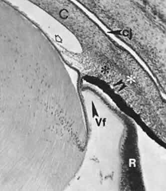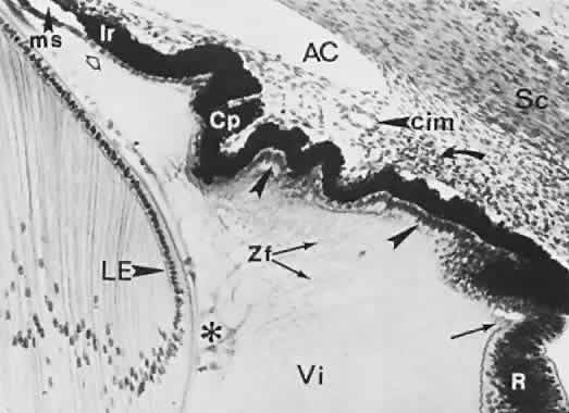 Regression of the peripheral branches of the hyaloid vasculature precedes zonular fiber appearance. During the sixth and seventh months of development (200 to 300 mm), the stainable vitreous regresses to its base on the pars plana and to its attachment to the lens (capsulohyaloidal ligament). Late in gestation, the fibers of the suspensory ligament (zonules) appear to originate from precursors in the valleys between the ciliary processes just anterior to the ora serrata. Early zonular fibers seem to be a continuation of the internal limiting membrane, which thickens over the nonpigmented epithelial layer covering the ciliary muscle.220,221 |