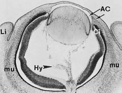 valuable information about the specific timing of events leading to malformations. In development of the eye, as in other organs, the multiplication of cells as well as directional change in shape, structure, and function of the cells govern growth. Gene determination decides the direction in which a change can occur, whereas the reciprocal demands of the individual cells or parts determine how far that direction must be followed. Fundamentally, the process consists of these two activities: change in structure and shape due to relatively different rates of growth and also change in structure and function due to differentiation and functional specialization. Induction of one ocular tissue by another and interrelations between these developing tissues have been extensively reinvestigated in many laboratories using various experimental techniques.5–21 One example is the lens, which arises in direct response to induction by the optic vesicle. The developing lens, in turn, promotes normal morphogenesis of neural ectodermal and mesenchymal elements in the eye. It has an inducing influence on corneal differentiation and promotes vitreous growth. Moreover, a strong organogenetic connection exists between lens and iris. The reciprocal interactions between optic cup and lens bring about the functional adjustment of the ocular axes. Although the neural retina grows and differentiates independently of the lens, the presence of the lens may influence the normal growth and change in shape of the pigment epithelium, choroid, and sclera. The pigment epithelium, however, directs the deposition of the mesenchyme around it; subsequently, all three layers grow in unison. The pigment epithelium also depends on the vitreous body for increase in its area. |