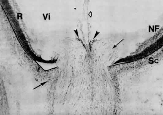At about the 24th day (2 to 4 mm) with the closure of the neural tube, the optic pits are pushed outward away from the central nervous system and toward the surface ectoderm. The two lateral bulges, caused by the outward extension of the growing optic pits, become pouch-shaped vesicles at about the 25th day of development (20 somite pairs) (Fig. 5; see Fig. 4D and E). The optic vesicles become sheathed with cells of neural crest origin27 that, except for a small region in the center of the bulge, separate them from the surface ectoderm (see Fig. 4E). The future primordium of the retina is present before closure of the neural tube, when the neural ectoderm is still open to the amniotic cavity. The optic stalk is formed by a constriction of the area between the vesicles and the future forebrain. At this time, all cells lining the inner surface of the vesicle's cavity are ciliated, and its outer surface, as well as the inner aspect of the surface ectoderm overlying it, is covered by a thin basal lamina. The next event is invagination of the optic vesicles by differential growth and buckling to form the optic cup (Figs. 6 to 9). The temporal and lower walls move inward against the upper and posterior walls. This process also involves the optic stalk so that the optic (choroid/embryonic/retinal) fissure is formed where the two laterally growing edges of the cup and stalk meet. Mesenchyme (primarily neural crest) penetrates immediately into the cup by filling up the fissure.