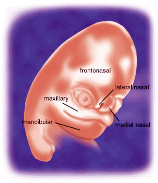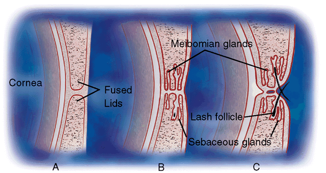SEGMENTATION Humans are segmented beings. Segmentation begins simultaneously with closure of the neural groove (24th day). Segmentation extends posteriorly and anteriorly to the head region, where segmentation is lost. Instead, five branchial or pharyngeal arches form. At 5 weeks' gestation, a sheet of immature mesoderm originates from the first branchial arch (“mandibular arch”). The first branchial arch consists of a small dorsal portion known as the maxillary process, which extends forward beneath the eye to develop into the lower eyelid. Cephalad to the first branchial arch, mesenchymal proliferation creates other folds that form other facial processes: the frontonasal, medial nasal, lateral nasal, and mandibular processes (Fig. 3).1–8 EYELID FORMATION The maxillary process lies in apposition to the paraxial mesoderm of the eye and the nasal process. Between them is a groove of thickened ectoderm, which becomes buried as the maxillary process overgrows the nasal process. This occurs at 5 weeks' gestation and is the first indication of the nasolacrimal duct. The maxillary process extends superiorly to form the lower eyelid at 6 weeks' gestation. In doing so, the inner end folds in a layer of ectodermal tissue that is continuous with the nasolacrimal duct at its lower end. Before the lower lids are apparent, the upper lids are formed by an extension of orbital or paraxial mesoderm known as the frontonasal process. Thus, the upper lid arises from the frontonasal process slightly before the lower lid arises from the maxillary process. The inner end of the upper lid also folds in a portion of ectodermal plate, which forms the upper canaliculus. This unites with the lower canaliculus at the upper end of the nasolacrimal duct.6–8 LID FUSION At 1.5 months' gestation, the lateral canthus is formed by the union of the upper and lower eyelid folds. The two lids come together and temporarily fuse from within outward at 8 weeks' gestation (Fig. 4A). Closure is complete at 10 weeks' gestation. Desmosomal adhesions between the lid margins isolate the eye from the amniotic fluid.1 All lid structures are formed during this period of adhesion (Fig. 4B). Riolan's muscle can be identified by the end of the third month. Hair bulbs of eyelashes appear first in the upper lids, then in the lower lids in an anteroposterior direction.2 Development is slightly more advanced in the upper lid, compared with the lower. At the beginning of the fourth month, the meibomian glands begin to appear. The posterior half of the lid shows a greater condensation of basal lamina and collagen fibers, indicating the tarsal plate region. The meibomian glands grow into the tarsal plates—first in the upper then in the lower lids. The apocrine Moll's glands also appear around the cilia follicles during the fourth month, followed shortly by the sebaceous glands of Zeis.3,6