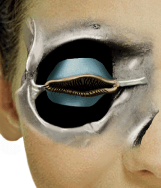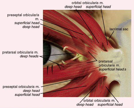 PROTRACTORS The orbicularis oculi muscle is a thin sheet of concentrically arranged muscle fibers covering the eyelids and periorbital region (Fig. 14). It is oval, with the long axis being horizontal, corresponding to the palpebral opening. Contraction of the orbicularis oculi muscle results in the protraction or closure of the eyelid. The orbicularis is firmly attached to the underlying lateral palpebral raphe, the medial canthal region, the insertions of the upper and lower eyelid retractors, the supraorbital ridge, the naso-orbital valley and the malar crease. Jones14,17 divided the orbicularis oculi muscle into three regions: orbital, preseptal, and pretarsal.