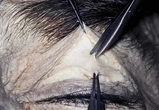 Langer lines (Fig. 11) are present in the upper and lower lids and in the canthal areas. These natural static skin lines are formed by collagenous, reticular, and elastic fibers in the reticular layer of the dermis. Gravitational lines (Fig. 12) are formed with age by progressive thinning of relaxed skin. In contrast, dynamic lines (Fig. 13) result from repetitious relaxation and contraction of paraorbital muscles. Horizontal forehead furrows show the lateral extent of the frontalis muscle used to correct chronic physiologic ptosis. The action of the procerus and corrugator superciliaris muscles create the “frown lines” between the eyebrows.