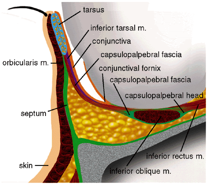 Lower Eyelid Posterior to the globe, a fibrous extension arises from the inferior rectus muscle. These extensions are collectively termed the capsulopalpebral head of the inferior rectus muscle. The capsulopalpebral head splits to surround the inferior oblique muscle. The external portion is termed the capsulopalpebral fascia, whereas the inner counterpart that contains smooth muscle is termed the inferior tarsal muscle. The two layers fuse anterior to the inferior oblique muscle to form a dense fibrous structure termed Lockwood's suspensory ligament of the globe.27,36 This ligament suspends the globe position within the orbit, even if all bone inferior to its attachments at the medial and lateral orbital walls are removed. The outer fibers of the capsulopalpebral fascia fuse with the inner fibers of the inferior orbital septum 4 to 5 mm below the inferior tarsus and together advance as a single layer to insert on the inferior border of the inferior tarsus (see Fig. 18).27,38 Although more rudimentary in their development, the capsulopalpebral fascia and the inferior tarsal muscle are analogous to the levator aponeurosis and the superior tarsal muscle of the upper eyelid. The capsulopalpebral fascia has no inherent innervation but its action mirrors the the action of the inferior rectus muscle, which is innervated by the inferior division of the oculomotor nerve. Depression of the lower eyelid in downgaze is less than the movement of the globe in downgaze. Magnetic resonance imaging studies39 have shown that this discrepancy is due to stretching of the capsulopalpebral head posterior to the inferior oblique muscle, whereas the length of the anterior portion of the capsulopalpebral fascia (between Lockwood's ligament and the tarsus) remain constant. In the lower eyelid, the more rudimentary inferior tarsal muscle arises from the inner surface of the capsulopalpebral head as it splits to surround the inferior oblique muscle. The inferior tarsal muscle consists of numerous discontinuous smooth muscle bundles and becomes totally fibrous as the inferior tarsus is approached.27 The inferior tarsal muscle is adherent to both the overlying capsulopalpebral fascia and to the underlying conjunctiva. The adherence of the capsulopalpebral fascia to the inferior tarsal muscle is stronger than the adherence of the inferior tarsal muscle to the conjunctiva. Thus, the capsulopalpebral fascia and the inferior tarsal muscle are often grouped together and termed “the lower lid retractors,” which during lower eyelid surgery are treated as one anatomic unit. The inferior tarsal muscle is sympathetically innervated. Clinically, in Horners' syndrome, the atonic muscle may allow the lower eyelid to elevate as much as 1 mm. Conversely, in thyroid eye disease, the lower eyelid may retract from increased sympathetic tone. TARSAL PLATES The tarsal plates are thickened fibrous connective tissue that provide structural support to the eyelids. Medially and laterally, the tarsal plates are connected to the bony orbital margins by ligamentous fibrous tissue (Fig. 26).40 Upper Eyelid The superior tarsal plate is 10 mm in vertical height and 25 to 30 mm in horizontal dimension. The border nearest the eyelid margin is flat, whereas the antimarginal border is curved with its largest vertical dimension centrally. From their central portion, each tarsal plate tapers toward the canthal ligaments. Within each superior tarsus lies 30 to 40 vertically oriented sebaceous secreting glands, the meibomian glands, which produce the outer lipid portion of the tear film. The orifices of the meibomian glands are located at the eyelid margin just anterior to the mucocutaneous junction. Lower Eyelid The inferior tarsal plate is 3 to 5 mm in vertical height and measures 25 to 30 mm horizontally.41 The lower tarsus also tapers medially and laterally. Within each lower tarsus, there are 20 to 30 vertically oriented meibomian glands whose orifices are located anterior to the mucocutaneous junction of the lower eyelid. The tarsi span the anterior orbital opening while articulating with the globe. With eyes closed, the lower eyelid covers a smaller area of the globe surface than does its upper eyelid counterpart. The posterior surface of both the tarsal plates is covered by conjunctiva. CONJUNCTIVA Embryologically, the conjunctiva represents the differentiated inner portion of the skin fold that forms the eyelid. It is composed of nonkeratinized stratified squamous epithelium with goblet cells. The goblet cells produce mucous for the inner layer of the tear film. The conjunctiva has two components: the bulbar conjunctiva, which lines the globe extending to the corneal limbus, and the palpebral conjunctiva, which lines the eyelid. These two conjunctival components meet at the conjunctival fornices. The superior conjunctival fornix is stabilized by the suspensory ligament of the superior fornix, which arises from the conjoining of the levator and the superior rectus muscles.37 The inferior conjunctival fornix is stabilized by the inferior suspensory ligament, which arises from the inferior rectus extensions that sheath the inferior oblique muscle. The superior fornix is located 13 mm from the open eyelid margin and 25 mm from the closed eyelid margin. The inferior fornix, however, is located 9 to 10 mm from the open or closed lower eyelid margin because the lower eyelid does not elevate significantly with eyelid closure. The bulbar conjunctiva is loosely attached to the globe, except at the limbus where it is tightly bound at the episclera. Similarly, the palpebral conjunctiva is loosely adherent, except at the tarsus and at the superior tarsal muscle where it is tightly adherent. In the lower eyelid, the conjunctiva is adherent to the lower tarsus but can be elevated from the lower eyelid retractors without difficulty. The conjunctival fornices are also stabilized by attachments medially and laterally to the canthal tendon.14,42 In addition t