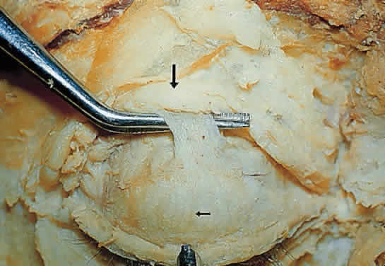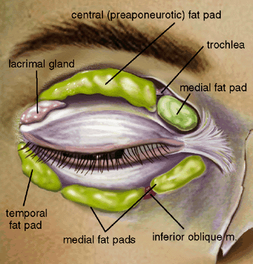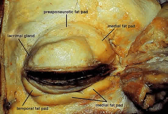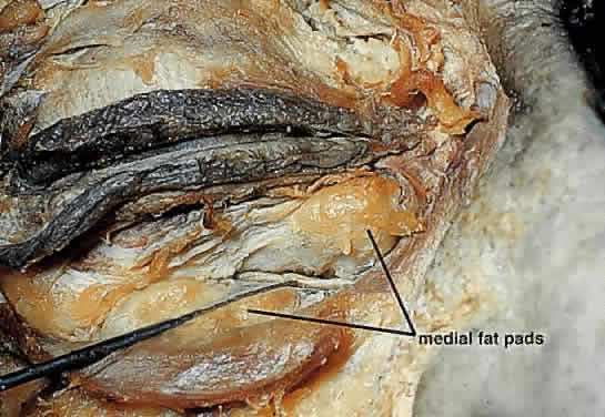 The orbital septum and the levator aponeurosis (Fig. 17) join 2 to 5 mm above the superior tarsal border. The orbital septum directly adjoins the posterior epimysium of the orbicularis for about 1 to 5 mm before joining the levator aponeurosis. The cross-sectional thickness of the orbital septum through its parallel lamella varies but is less than 1 mm. It is thickest at the arcus marginalis laterally and is thinnest in the lower lid medially. Medially, posterior orbital septal lamella are carried posteriorly by the pretarsal orbicularis muscle, which inserts on the posterior lacrimal crest. Superficial orbital septal fibers, as described by Whitnall,14 appear to cross and adhere to the lacrimal fascia before reaching the anterior lacrimal crest. At the lateral canthus, the orbital septum is also split; deep fibers insert at Whitnall's tubercle, whereas superficial fibers join at the lateral canthal raphe, just deep to the orbicularis muscle.23 Variation in septal strength is seen between individuals and varies with age. Clinically, weakness of the septum explains the medial upper lid bulge (bourrelet senile) seen in older patients and due to herniation of the medial fat pad through an attenuated septum (see Fig. 10).25 It also may explain the high incidence of orbital invasion of basal cell carcinoma in the medial canthal region.26 Lower Eyelid In the lower eyelid, the orbital septum (Fig. 18) arises from the inferior orbital rim as a condensation of the periosteum and the periorbita. It continues anteriorly and superiorly to a point 4 to 5 mm below the inferior tarsus, where it joins with the lower eyelid retractors and as a single structure inserts on the lower border of the inferior tarsus.23,27 Medially, the orbital septum splits and is carried posteriorly by the pretarsal orbicularis muscle (Horner's muscle) and attaches to the posterior lacrimal crest. Laterally, the orbital septum also splits and is carried deep by the insertion of the orbicularis. The orbital septa of the upper and lower eyelids form an anatomic barrier between the preseptal and orbital structures. Infectious processes anterior to the septa are considered to be more benign than those posterior to the septa. Functionally, the suborbicularis oculi fibroadipose layer and the multilayered orbital septum change with movement, enhancing eyelid and eyebrow mobility.14,23 FAT PADS Fat within the orbit and adnexa serve as a protective cushion within which the eyeball moves. Fat within the muscle cone is termed central or conal. Fat outside the muscle cone is termed peripheral or extraconal. Upper Eyelid In the upper eyelid, there are two specific fat pads: the medial fat pad and the central fat pad (Figs. 19 and 20). The whitish medial fat pad is more fibrous, whereas the larger central fat pad is more yellow because of a decreased amount of fibrous tissue. The larger central fat pad is termed the preaponeurotic fat pad. The trochlea separates the two fat pads.28 Clinically, the preaponeurotic fat pad lies directly on the surface of the muscular portion of the levator and serves as an important surgical landmark to the levator aponeurosis immediately beneath it. The medial fat pad often herniates through a weakened orbital septum, creating a bulge beneath the trochlea. The preaponeurotic fat is surrounded by a thin translucent connective tissue capsule. Fine connective tissue septa extend anteriorly from the capsule of the preaponeurotic fat to the orbital septum and posteriorly to the levator aponeurosis.23 Clinically, these connections are easily broken by blunt dissection, exposing an encapsulated preanoneurotic fat pad. Connective tissue septa also exists within the preaponeurotic fat, dividing it into lobules. Although the preaponeurotic fat pad is contiguous with deeper orbital fat, these connections are more rudimentary than the medial and lower eyelid fat pads. The preaponeurotic fat pad is less vascular than the other fat pads. Conversely, the medial fat pad is more vascular because of the location of the palpebral arterial arcade, which serpiginously courses through this pad.29,30 The medial fat pad is separated from the preaponeurotic fat pad by delicate fibrous septal attachments to the trochlea. Lateral to the preaponeurotic fat pad lies the lacrimal gland, which is typically pinker in appearance, firmer in texture, and distinctly more vascular than the preaponeurotic fat pad.31 During removal of orbital fat, the eyelid surgeon is careful to avoid injury to the laterally located lacrimal gland. Lower Eyelid In the lower eyelid, there exists a smaller temporal fat pad and a larger medial fat pad (see Figs. 19 and 20). The temporal fat pad lies inferior to the lateral canthus. It is separated from the larger medial fat pad by a fibrous extension from the periorbita and orbital septum infralaterally, joining with the capsulopalpebral fascia and Lockwood's ligament.28,32 The medial pad extends from the fascial band to the medial canthal area. It is a single pad anteriorly but posteriorly is divided by the origin of the inferior oblique muscle (Fig. 21). With this subdivision of the larger medial fat pad of the lower lid, some surgeons consider the lower lid to have three fat pads.15,32