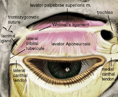 SUSPENSORY SYSTEM OF THE EYELIDS Five anatomic structures provide support and mechanical function to the eyelid and eyeball: Whitnall's ligament, Lockwood's ligament, the lateral canthal ligament, the medial canthal ligament, and the eyelid margin. Whitnall's Ligament The superior transverse ligament of Whitnall provides the dual function of acting as the main suspensory ligament of the upper eyelid and as a check ligament for the levator aponeurosis and levator muscle.24,44,45 It also gives superior conjunctival fornix suspension.34,37 The suspensory role and fulcrum effect of Whitnall's ligament is assisted by the curvature of the globe, which also provides a fulcrum and support for the levator.34 Whitnall's ligament is suspended from the periorbita of the orbital roof, extending medially from the trochlea across the horizontal dimension of the orbit to the frontozygomatic suture, 10 mm superior to the lateral orbital tubercle (Whitnall's orbital tubercle). Laterally, it sends weaker attachments to Whitnall's tubercle but the most significant lateral attachment site of Whitnall's ligament is at the frontozygomatic suture (see Fig. 22). Whitnall's ligament is found 15 to 20 mm superior to the superior border of the tarsus as a white, shiny, glistening structure where the levator muscle becomes an aponeurosis. Clinically, this is an important structure encountered frequently during eyelid surgery. Lockwood's Ligament Lockwood's ligament in the lower eyelid is more rudimentary than Whitnall's ligament in the upper eyelid but it acts as a suspensory hammock for the globe.36 It also serves as an anchor for the inferior conjunctival fornix. Lockwood's ligament is a condensation of the capsulopalpebral fascia anterior to the inferior oblique muscle.27 It is composed of thickened Tenon's capsule, intramuscular septa, check ligaments, fibers from the inferior rectus sheath, and lower lid retractors. Medially, it attaches to the medial canthal ligament and laterally to the lateral canthal ligament. Lateral Canthal Ligament Often called the lateral canthal tendon, the lateral canthal ligament is comprised of a superior crux from the superior tarsus and an inferior crux from the inferior tarsus. The superior and inferior crux of the lateral canthal tendons fuse at the lateral border of the tarsal plates to join the lateral retinaculum, a condensation of several anatomic structures that inserts onto the lateral orbital tubercle of Whitnall. This tubercle is located 2 to 4 mm posterior to the lateral orbital rim, 10 to 12 mm inferior to the frontozygomatic suture, and at the level of the lateral commissure.40 The lateral retinaculum consists of fibers from the lateral horn of the levator aponeurosis, Lockwood's ligament, check ligaments of the lateral rectus muscle, fibers of the suspensory ligaments of the lacrimal gland, and some deep fibers of the pretarsal orbicularis oculi muscle. In the space between the lateral retinaculum and the more anteriorally placed orbital septum is sometimes found a small fat pad, Eisler's pocket.22 The lateral canthal ligament is a clinically important anatomic structure. The inferior and superior crux of the lateral canthal ligament must be released from the tarsal plates during a lateral canthotomy or cantholysis to decompress the orbit and to lower intraorbital pressure. Medial Canthal Ligament The medial canthal ligament, often called the medial canthal tendon, provides support to the eyelids and aids in the function of the lacrimal pump.18 The medial canthal ligament has two components—an anterior limb and a posterior limb. The anterior limb (Fig. 27) is a broad fibrous structure that attaches the eyelids to the frontal process of the maxillary bone and to the anterior lacrimal crest. It gives origin to the superficial head of the pretarsal orbicularis oculi muscle. The posterior limb of the medial canthal ligament inserts on the posterior lacrimal crest and the lacrimal fascia. It is weaker than the anterior limb but with the deep heads of the pretarsal and preseptal orbicularis muscle draws the medial portion of the eyelids posteriorly to follow the vector forces necessary for good medial apposition of the eyelids to the globe.31 Eyelid Margin The eyelid margins are divided by the lacrimal puncta into a medial lacrimal portion and a lateral palpebral portion. At the lid margin near the medial edge of the tarsus, the lacrimal papilla is seen as the fibrous ring surrounding the lacrimal punctum. The medial lacrimal portion is rounded and without lashes. It carries the horizontal portion of the canaliculi 1 to 2 mm from the marginal surface. The upper punctum is located at the junction of the medial 1/6 and the lateral 5/6 of each eyelid. The lower punctum is located slightly more laterally than the upper punctum. The longer lower canaliculus (10 mm) is directed into the lacrimal lake lateral to the plica semilunaris, whereas the shorter superior canaliculus (8 mm) is directed between the plica semilunaris and the caruncle. The canaliculi are surrounded by thick pretarsal orbicularis oculi muscle fibers. Posterior and horizontal contraction slightly inverts the medial eyelid margin. The lateral portion of the lid margin has a more distinct or sharp border, which acts like a “squeegee” or “windshield wiper” to assist in moving the tear film toward the punctum. At the level of the tarsus, both the upper and lower eyelids consist of four anatomic structures: the skin, the orbicularis oculi muscle, the tarsus, and the conjunctiva. At the eyelid margin, the eyelids are arbitrarily divided into an anterior lamella, consisting of the skin and orbicularis oculi muscle, and a posterior lamella, consisting of the tarsus and conjunctiva. This distinction is only approximate because fibrous elements from the tarsus extend anteriorly, hair follicles may extend posteriorly to imbed in the tarsus, and fine interdigitations of the eyelid retractors may be found. The sk