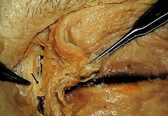 The pretarsal orbicularis is firmly adherent to the underlying tarsus and to the superficial insertion of the levator aponeurosis at the superior tarsal border. The medial origin of the pretarsal orbicularis is thought to arise from two heads—the deep and the superficial heads. The deep head, Horner's tensor tarsi muscle,19,20 arises from 4 mm behind the posterior lacrimal crest and from the lacrimal fascia to insert medially on the tarsi of the upper and lower eyelids. Its contraction pulls the eyelid medially and posteriorly, allowing the eyelids to follow and cover the convex globe. In addition, its lateral contraction on the lacrimal diaphragm creates a negative pressure in the lacrimal sac that draws tears from the canaliculi. The superficial head of the pretarsal orbicularis inserts on the anterior lacrimal crest and anterior limb of the medial canthal ligament. Superficial fibers also surround the canaliculi. Contraction shortens the canaliculi, forcing lacrimal fluid into the lacrimal sac. Functionally, involuntary lid closure (blinking) is primarily the responsibility of the smaller pretarsal orbicularis fibers. Medially, both Horner's and Jones muscles are essential for proper functioning of the lacrimal pump. The deep fibers medially and posteriorly are responsible for proper eyelid-to-globe apposition. Laterally, the orbital and preseptal fibers fuse over the zygoma to form the lateral palpebral raphe. The deep fibers of the pretarsal orbicularis join the inferior and superior crux of the lateral canthal ligament, which inserts 3 to 4 mm posterior to the lateral orbital rim on Whitnall's tubercle.21 It is these latter posteriorly oriented attachments that are responsible for proper eyelid-to-globe apposition and not the more superficial fibers. ORBITAL SEPTUM Upper Eyelid Historically, the orbital septum has been considered as a discreet, well-defined structure arising from the arcus marginalis. The arcus marginalis is a discrete line seen at the supraorbital rim, representing the condensation of the periosteum of the forehead with the periorbita of the orbit. Alternatively, the orbital septum may be considered the deep fascia of the overlying orbicularis oculi muscle.14 Others describe a loose fibrous connective tissue anterior to the orbital septum and refer to it as the ‘suborbicularis fascia.’22 The orbital septum (Fig. 16) actually is a multilayered structure.23 Fibrous septa within the submuscular fibroadipose tissue become contiguous with more compact lamellae of the orbital septum, imparting a multilayered quality to the orbital septum. Fat within the fibroadipose layer anterior to the orbital septum may be mistaken for the preaponeurotic fat pad during eyelid surgery.24