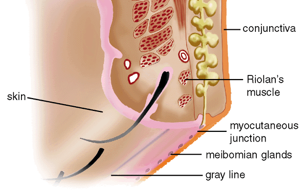 The skin of the eyelids is thin. The transition to the thicker skin of the eyebrow above and to the skin of the malar region below is abrupt. In the preorbital and preseptal skin, subcutaneous fat is sparse. Fat is absent in the pretarsal skin. Pretarsal skin is firmly adherent to the underlying tarsus because of attachments of the levator aponeurosis.16 Clinically, edema collects under the loose preorbital and preseptal skin, leaving an identifiable border at the pretarsal skin where there are denser subcutaneous fibroadipose attachments. |