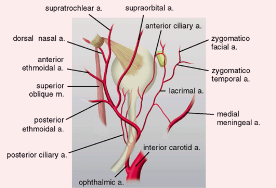 ARTERIAL SYSTEM The eyelids receive a rich and anastomotic supply of blood from the internal carotid system (the deep or intraorbital system) and the external carotid system (the superficial or facial system). Deep Arterial System At the orbital apex, the ophthalmic artery—a branch of the internal carotid artery—lies lateral to the optic nerve. As the ophthalmic artery passes over the optic nerve and supramedially within the orbit, four terminal branches pierce the orbital septum to supply the upper eyelid (Fig. 29). The four named branches are the lacrimal artery, the supraorbital artery, the supratrochlear (frontal) artery, and the dorsal nasal artery. The lacrimal artery is the most temporal branch and runs forward along the upper border of the lateral rectus muscle with the lacrimal nerve to supply blood to the lacrimal gland, the conjunctiva, and the lateral aspect of the upper eyelids.47 The lacrimal artery terminates as the lateral palpebral artery. The supraorbital artery arises from the ophthalmic artery as it courses over the optic nerve. The supraorbital artery travels forward in the orbit between the levator muscle and the periorbita of the orbital roof. It accompanies the supraorbital nerve through the supraorbital foramen to supply blood to the upper eyelid, scalp, forehead, levator muscle, periorbita, and diploe of the frontal bone. The supratrochlear (frontal) artery accompanies the supratrochlear nerve to supply arterial blood to the skin of the superior medial aspect of the orbit, the forehead, and the scalp. The ophthalmic artery continues dorsally and nasally within the orbit to terminate as the fourth branch, which pierces the orbital septum and is known as the dorsal nasal artery. It supplies the skin of the bridge of the nose and the lacrimal sac. It terminates as the medial palpebral artery. The medial palpebral artery and the lateral palpebral artery richly anastomose to form two well-defined arterial arcades in each upper eyelid—the marginal palpebral arcade and the peripheral palpebral arcade. The marginal palpebral arcade lies on the anterior tarsal surface 2 to 3 mm from the eyelid margin. The peripheral palpebral arcade parallels superior to the superior border of the tarsus, posterior to the levator aponeurosis, and anterior to Müller's muscle (Fig. 30). Medially vascular arcades have a serpiginous course through the medial fat pads of the upper eyelid, which may result in bleeding if incised during eyelid surgery.30 The deep peripheral palpebral arcade supplies the superior conjunctival fornix and anastomoses with the anterior ciliary arteries near the corneal scleral limbus.