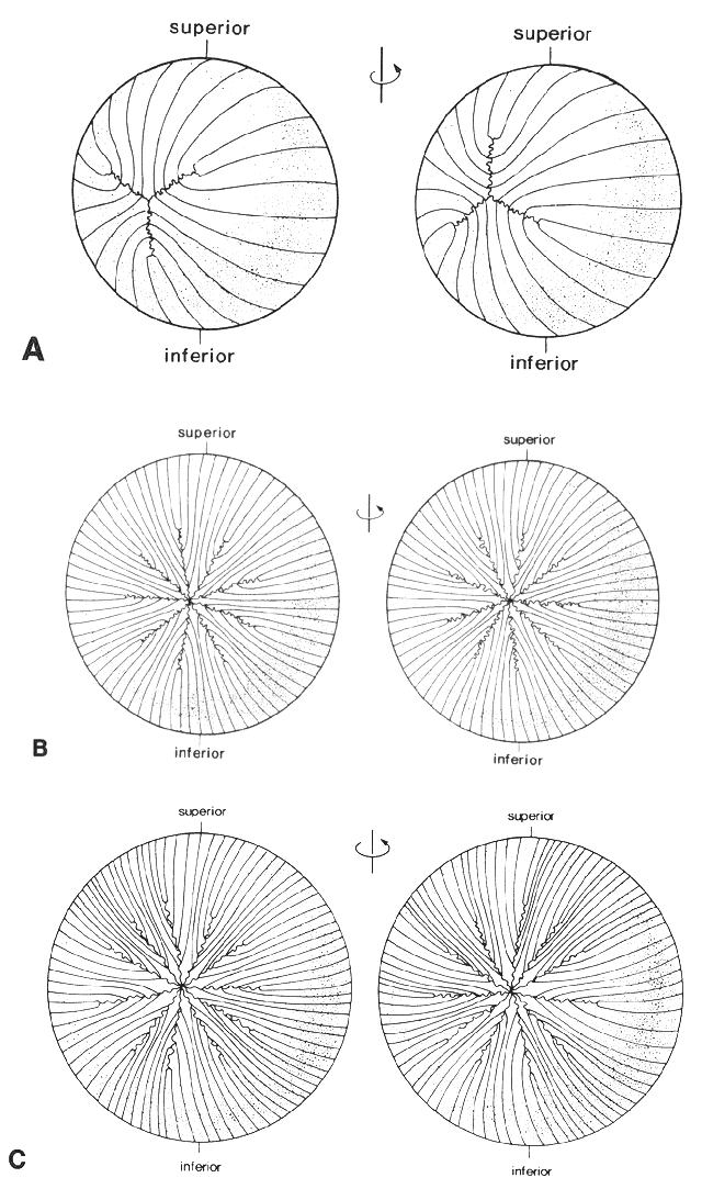 Fig. 10. A. Diagrammatic representation of the anterior (left) and posterior (right) suture patterns of a newborn human lens. Note the offsetting anterior and posterior suture patterns as a consequence of opposite curvature of each end of the fiber cell. B. Scalar diagrammatic representation of the anterior (left) and posterior (right) suture patterns of a young adult human lens. Note the starburst pattern with nine equally spaced radial spokes. C. Scalar diagrammatic representation of the anterior (left) and posterior (right) suture patterns of an aged human lens. The number of spokes has increased, and the anterior and posterior suture patterns have become asymmetric with respect to each other. (Courtesy of Dr. Jer Kuszak, Rush Presbyterian St. Lukes Medical Center)
