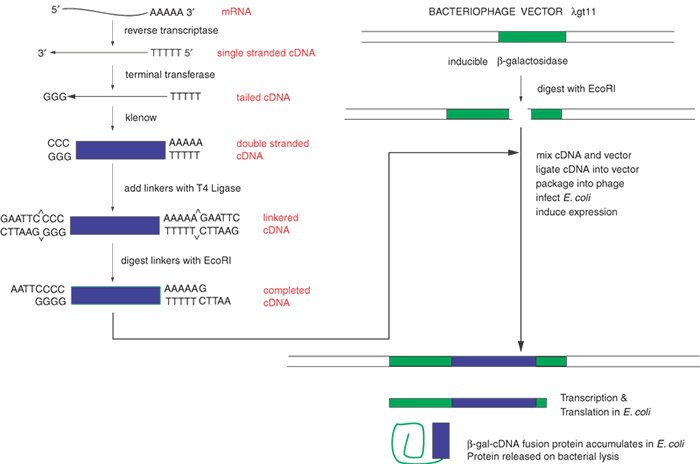 MOLECULAR BIOLOGY Molecular biology is the detailed study in detail of polymers of nucleic acids (DNA and RNA) that encode gene products, largely proteins. It also is the study of the control and regulation of gene expression. “Molecular biology is a discipline, a level of analysis, a kit of tools—which is to say, it is unified by style as much as by content. The style is unmistakable. The style is bold; it is simplifying; it is unsparing; often it is extremely competitive. The style is also, sometimes, subtle and sophisticated.”5 DNA DNA is the fundamental genetic material that encodes genes. In almost all forms of life, DNA is replicated and passed from one generation to the next. Information is stored in DNA by the sequence of the bases in the molecule: adenine (A), guanine (G), cytosine (C), and thymine (T). By convention the sequences from left to right are the 5' to 3' orientation of the sense strand of the DNA molecule, where “5'” is the fifth position on the deoxyribose and the “3'” refers to the third carbon atom of deoxyribose. Information about a gene product is stored in groups of three bases. The genetic code decodes the triplets of bases, translating the DNA sequence through its messenger RNA (mRNA), an RNA copy of the DNA sequence, into an amino acid sequence. The amino acid sequence folds into a three-dimensional structure, forming a protein that is capable of some biologic function. For the most part proteins, rather than DNA or RNA, constitute the physiologic cellular machinery. Recent developments suggest that small RNAs play important roles in metabolism and that small RNAs may be used therapeutically to interfere with the expression of some genes.6 RESTRICTION ENZYMES The discovery of restriction enzymes by microbiologists studying Escherichia coli and other bacteria provided a foundation for modern molecular biology. These enzymes, which are found in a variety of prokaryotes, cut the DNA double helix at specific base sequences, or sites. These sites are short but specific DNA sequences, usually four to eight bases in length. The natural function of a restriction enzyme is to degrade the DNA of invading viruses in order to protect the bacterium from infection. For example, the restriction enzyme EcoRI recognizes the sequence GAATTC in DNA and cleaves the DNA between the G and the first A. Over 500 different restriction enzymes, each recognizing a different DNA sequence, are now commercially available. They usually recognize sequences that are palindromic (reading the same forward and backward). When these enzymes cut the DNA strands in the middle of their recognition sequence, blunt ends are formed. When the strand scissions are offset, overlapping single-stranded ends of two or four bases are created. These “sticky ends” can occur with an overhang of the 3' strand (e.g., as produced by the restriction enzyme, Pst I) or with the 5' strand (e.g., as with EcoRI). Because any sticky ends created by digestion with the same restriction enzyme can reanneal readily under the proper conditions, these enzymes provide a powerful tool for inserting foreign DNA fragments into many vectors or other constructions. This allows virtually all sequences from the human genome to be cloned (inserted into plasmid or bacteriophage vectors and replicated in bacteria), so that large amounts can be isolated in pure form. One way in which a bacterium protects its own DNA from digestion with its own restriction endonuclease is with a methylase that recognizes and adds a methyl group to the given sequence. This sequence, once methylated, is no longer a target for some restriction endonucleases. Other restriction endonucleases are not inhibited by methylation, and these can recognize exactly the same sequences as the homologs that are inhibited. Two restriction enzymes that recognize the same base sequence but are isolated from different organisms are called isoschizomers. Just as isoschizomers may or may not react similarly to methylation, they may not cut the DNA strands at the identical site within the recognition sequence, and thus they may not produce identical ends. Although these differences are of more central concern to cloning and rearranging DNA fragments, they also can be important in gene mapping. For example, the use of a methylation-sensitive restriction endonuclease for analysis of restriction fragment length polymorphisms (RFLPs) might suggest genetic (DNA sequence) polymorphism when none exists. Methylation plays a role in gene expression in higher eukaryotes, and the use of pairs of isoschizomers, one of which is inhibited by methylation, is a means of assessing gene inactivation. Usually a gene that is not expressed in a given tissue is methylated, whereas the same gene is not methylated in a tissue where the gene's expression is needed. RECOMBINANT TECHNOLOGY Recombinant DNA technology is the set of techniques and tools used by molecular biologists to manipulate DNA molecules. Recombinant DNA technology allows the preparation of large amounts of a pure and homogeneous DNA sequence. Figure 1 illustrates the fundamentals of the technology with a procedure called subcloning. This procedure begins with a DNA sequence of interest, for example, part of a gene or cDNA that will be “inserted” into a second, usually larger, piece of DNA, called a “vector,” which is used to propagate the gene fragment. Vectors usually are derived from bacterial viruses (bacteriophages) or bacterial plasmids, small double-stranded DNA circles commonly found in bacteria that replicate autonomously from the bacterial DNA. The vectors usually have been manipulated to delete parts of the parental plasmid or virus and frequently have had other genes added to them depending on their specific application. To subclone the gene fragment into a different vector, some sequence information or knowledge of the positions of restriction enzyme recognition sites is required. The sequences of 